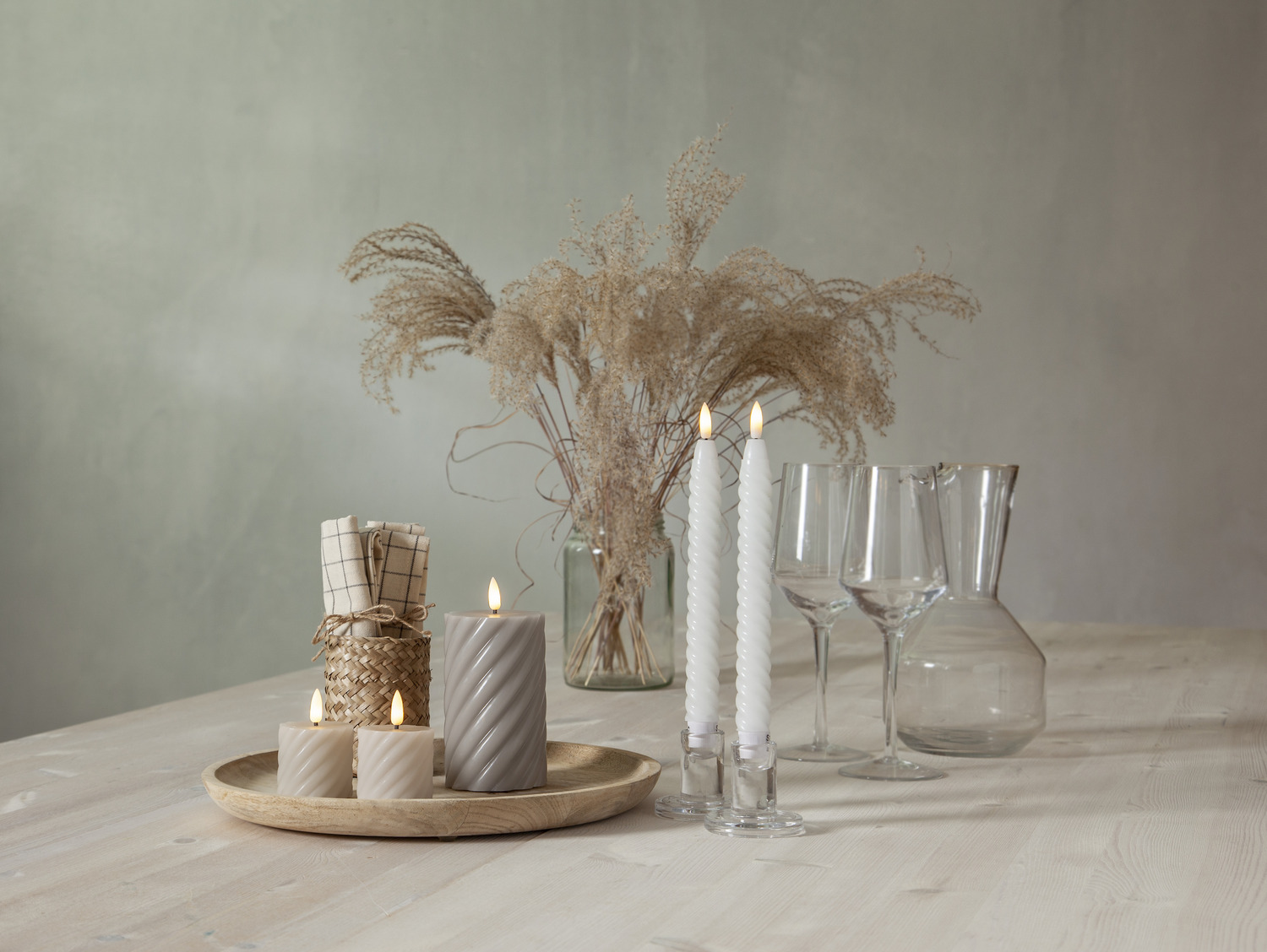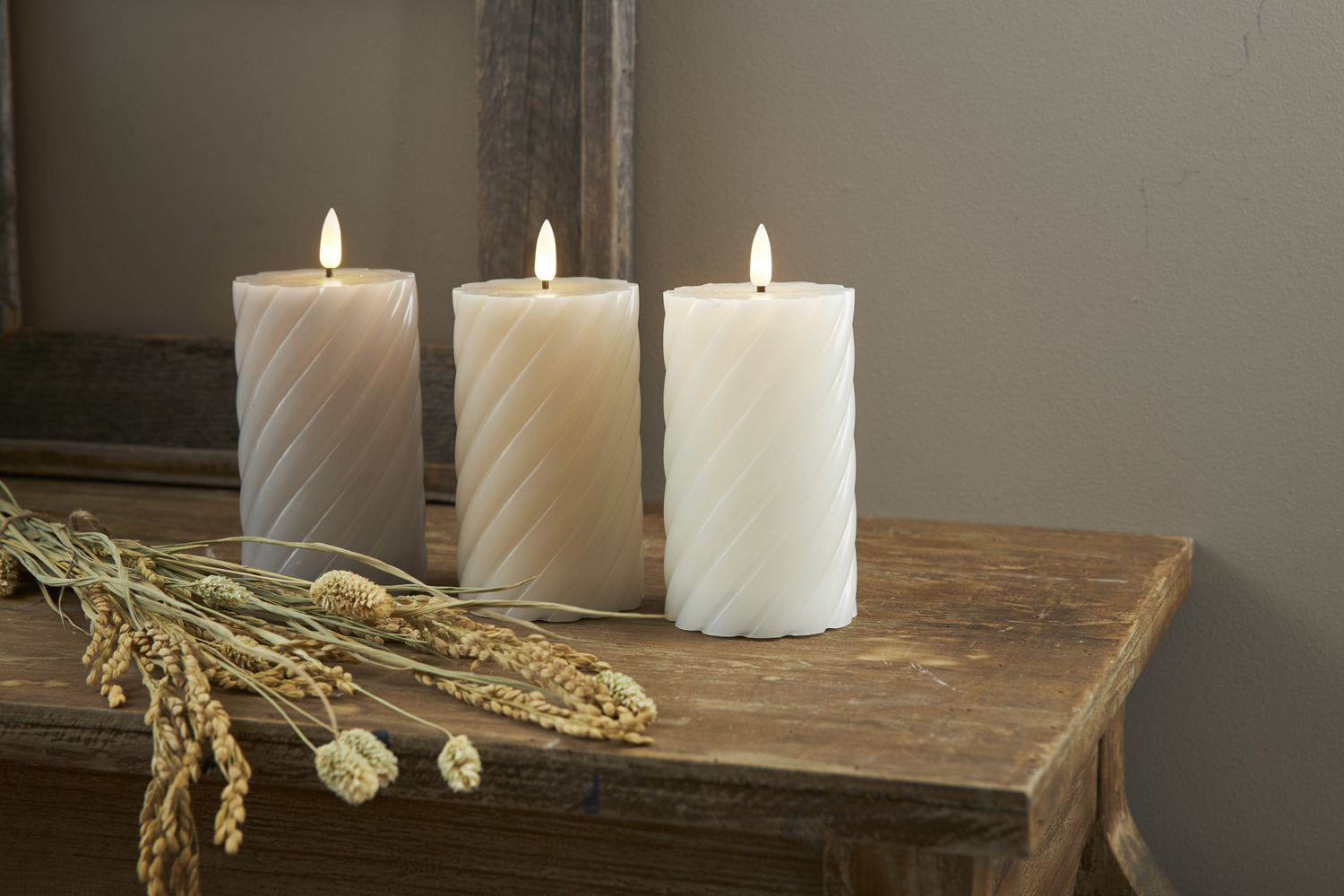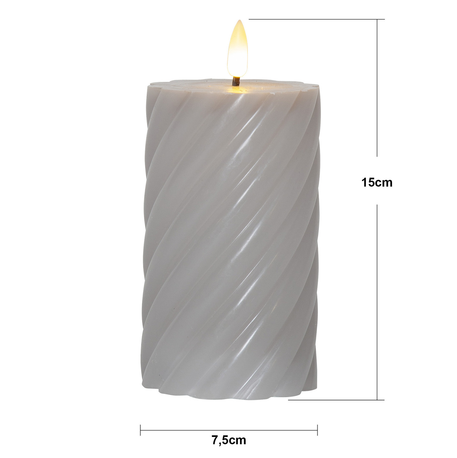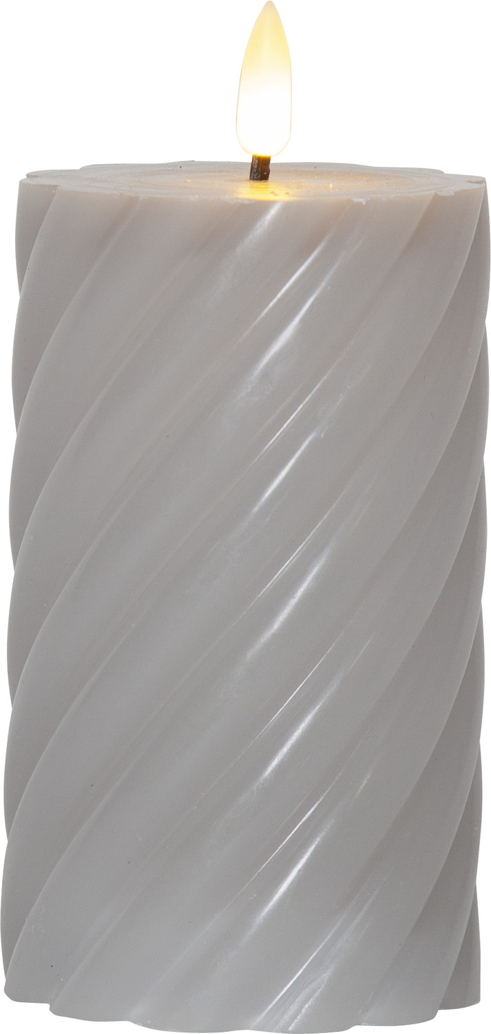 LED-küünal sooja valge valgusega sobib suurepäraselt meeleolu loomiseks siseruumides. Halli tooniga küünal kuulub Flamme sarja ning selle pinnal on dekoratiivne spiraalne reljeef. Leek liigub loomulikult ja kumab õrna valgusega, meenutades päris küünalt. Sisseehitatud taimer hoiab küünla 6 tundi sees ja 18 tundi väljas, korrates tsüklit igapäevaselt. Sobib hästi kohtadesse, kus elav tuli ei ole lubatud või soovitatav.