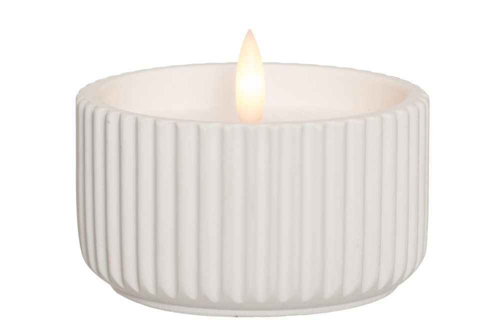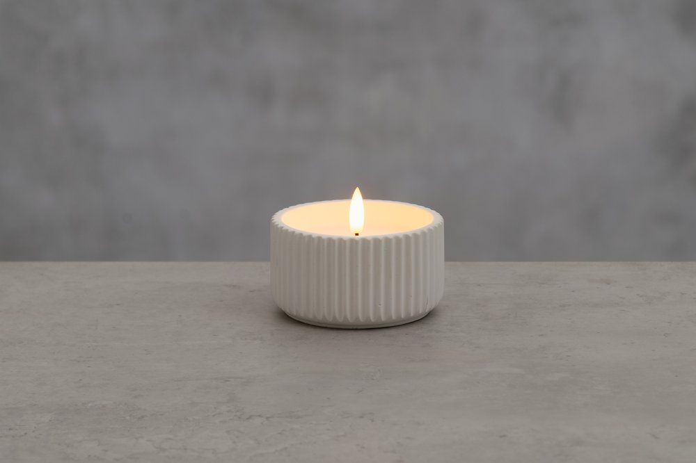 Dekoratiivne LED-küünal realistliku 3D-leegiga loob hubase valguse ja turvalise alternatiivi pärisküünlale. Küünal on asetatud modernsesse valgest tsemendist soonelise pinnaga anumasse, mis sobitub hõlpsasti erinevatesse interjööridesse. Sisseehitatud taimer lülitab tule automaatselt sisse 6 tunniks ja välja 18 tunniks.