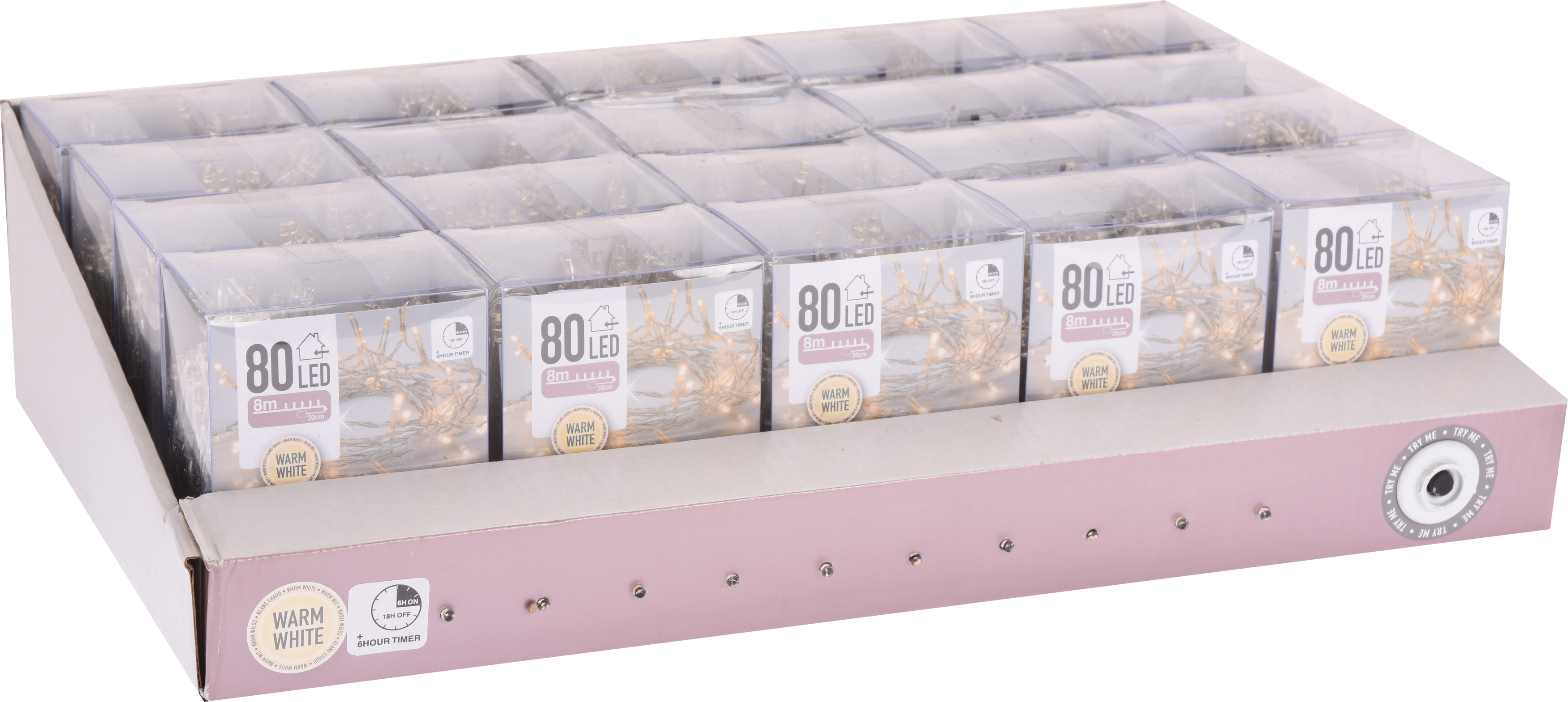 • Valgusketi pikkus 8m • LED pirnide arv: 80. • LED värv: soe valge. • Kaabli värv: läbipaistev. • Toide: 3 AA patareid (ei kuulu komplekti). • Sisseehitatud taimer: 6 tundi sisse, 18 tundi väljas. • IP44 kaitseklass. • Sobib siseruumis kasutamiseks. • Materjal: plastik.