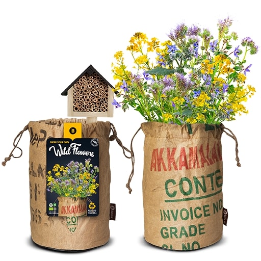 Lillemuru Looduslik Aed Kollane komplektis on kasvatuskott, substraat, 3 pakki seemneid ja putukahotell.