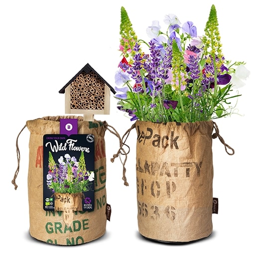 Lillemuru Looduslik Aed Lilla komplektis on kasvatuskott, substraat, 3 pakki seemneid ja putukahotell.