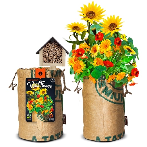 Lillemuru Looduslik Aed Oranž komplektis on kasvatuskott, substraat, 3 pakki seemneid ja putukahotell.