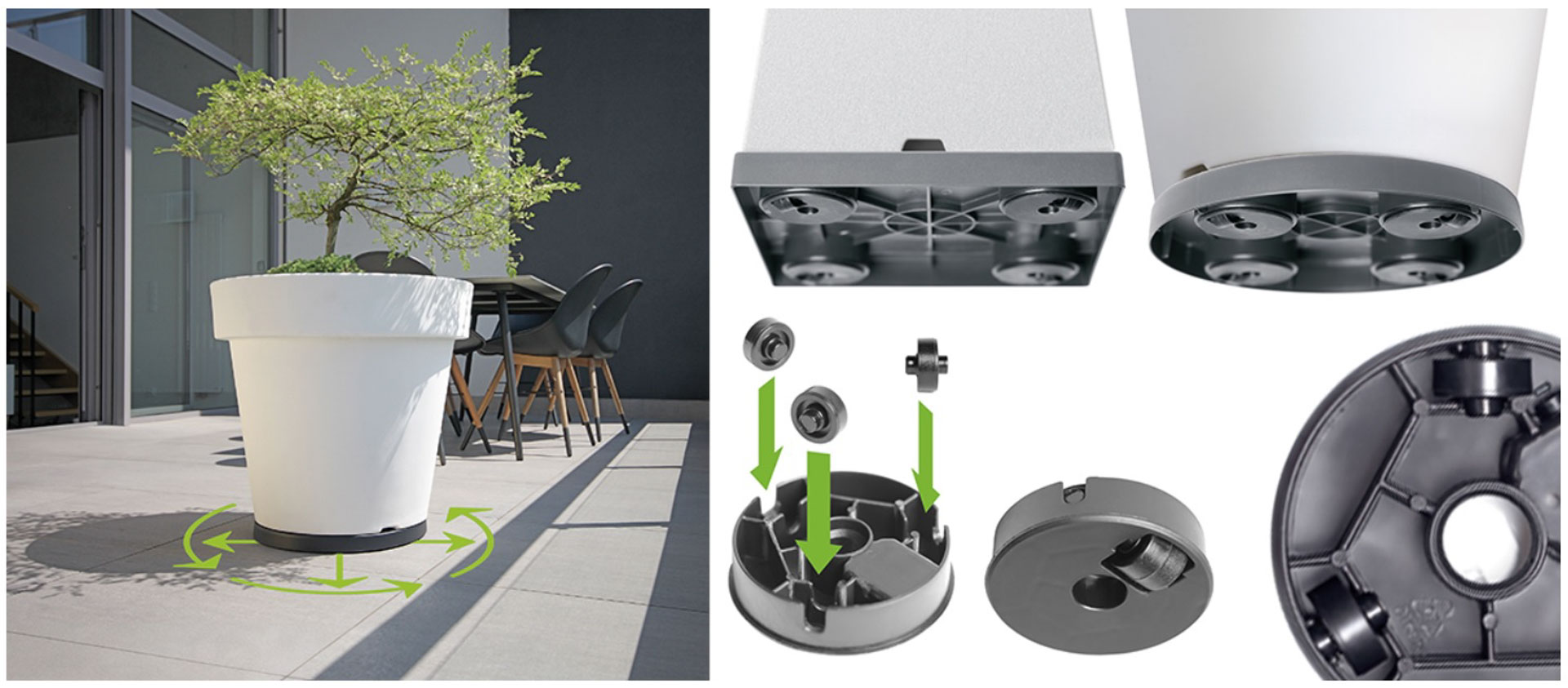 Ümmargune liikuv lillepoti alus, millel on 4 iseseisvat ja stabiilset ratast, mis võimaldavad 360-kraadist sujuvat pöörlemist. Alus on loodud raskete ja tugevate lillepottide transportimiseks. See on funktsionaalne ja esteetiline ning valmistatud vastupidavast plastist. Tänu rullikute konstruktsioonile ja kinnitusviisile jäävad need peaaegu nähtamatuks.