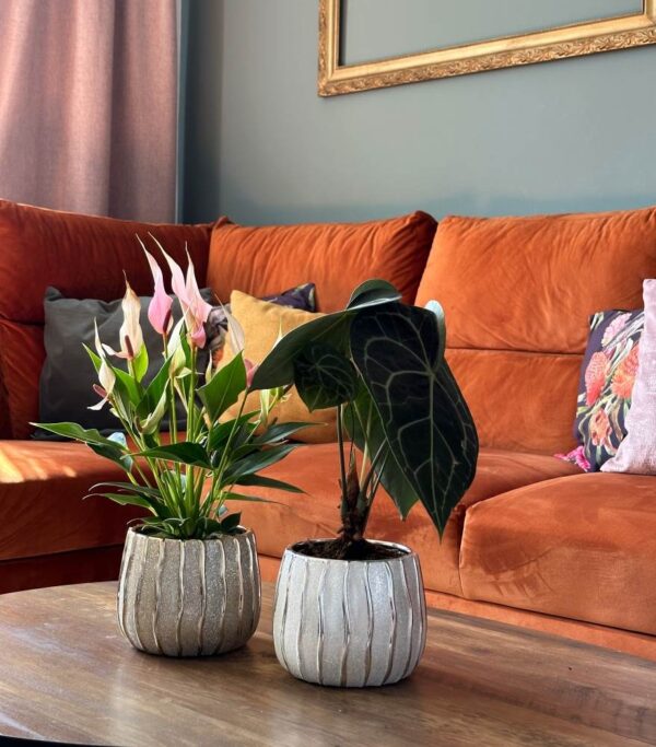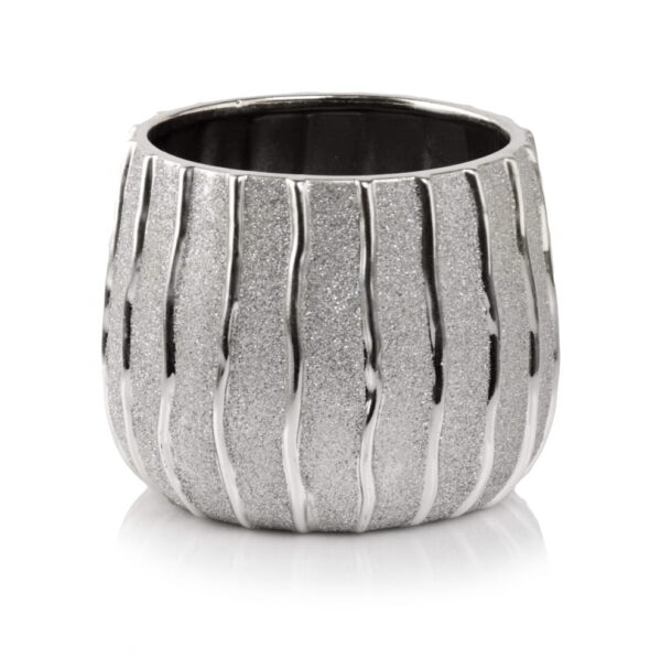 Reljeefsed, lainelised triibud loovad ainulaadse tekstuuri ja luksusliku välimuse, muutes poti efektseks detailiks nii klassikalises kui ka modernses interjööris. Hõbedane läige koos diskreetse sädelusega annab sellele piduliku ja stiilse ilme.