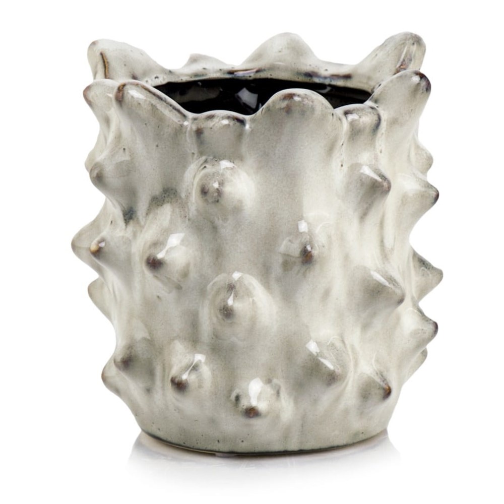 Ogad ümbrispott on julge disainielement, mis ühendab endas lillepoti ja vaasi omadused. Selle iseloomulik pind, mida katavad ümarad ogataolised väljaulatuvad vormid, annab potile mängulise ja veidi mässumeelse iseloomu. Samal ajal tasakaalustab kergelt vanutatud kreemikas ja hallikas toon kogu kompositsiooni, muutes selle harmooniliseks ja stiilselt tasakaalus aktsendiks. See on ideaalne valik neile, kes hindavad isikupärast ja silmapaistvat disaini.