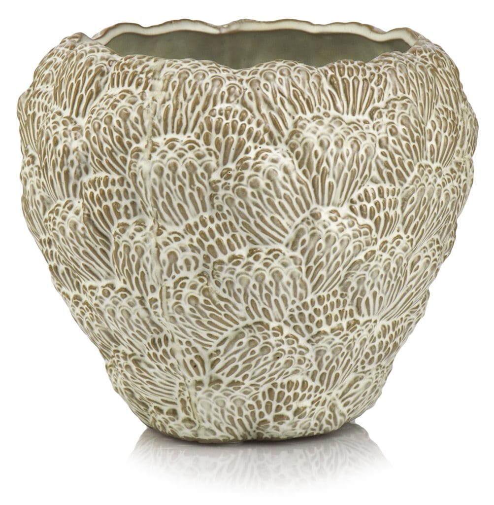 Õied ümbrispott paistab silma oma kitseneva vormi ja ruumilise pinnamustriga, mis on loodud peente nikerdustega üle kogu poti pinna. Kreemikas-beež toon lisab potile peene, ent väljendusrikka ilme, sobitudes suurepäraselt mustri ja taime rohelusega. Tegemist on õhulise ja fantaasiarikka disainiga, mis toob interjööri isikupära ja pehmust.