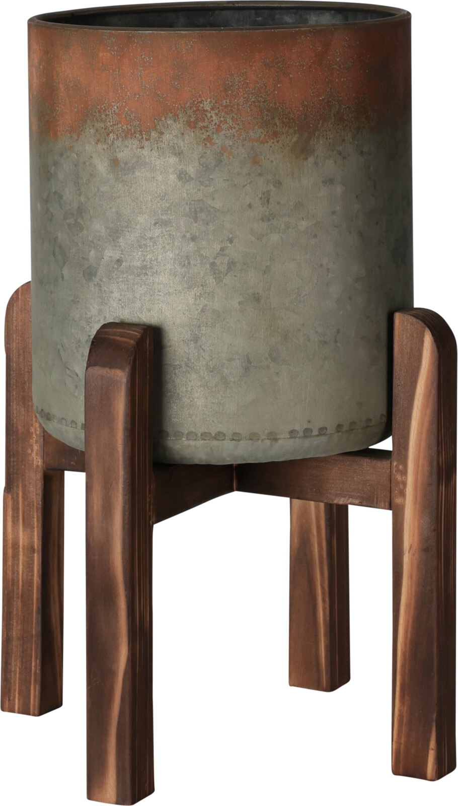 Terasest lillepott puidust jalaraamil ühendab industriaalse ilme ja naturaalse materjali soojuse. Metallist poti pind on antiikviimistlusega ning kergelt roostehõngulise efektiga, mis annab sellele iseloomuliku ja ajatu välimuse.