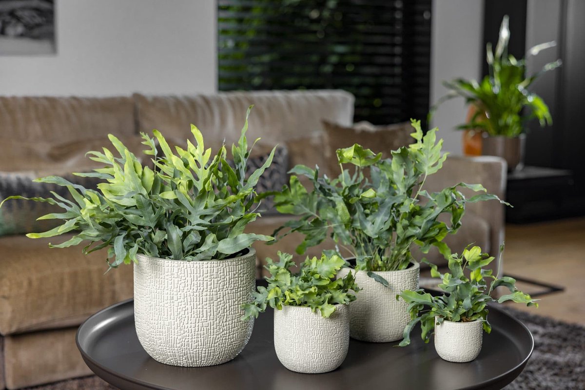 Lillepott Skin on käsitsi viimistletud siseruumide lillepott, mille ainulaadne reljeefne tekstuur meenutab peenelt struktureeritud mosaiiki või geomeetrilist mustrit. See kaasaegne disain lisab visuaalset põnevust ja elegantsi igale taimele, rõhutades samal ajal ruumi üldist stiili. Potil on olemas drenaažiava ja see on valmistatud kergest ning vastupidavast plastist, mis sobib ideaalselt igapäevaseks kasutamiseks siseruumides.
