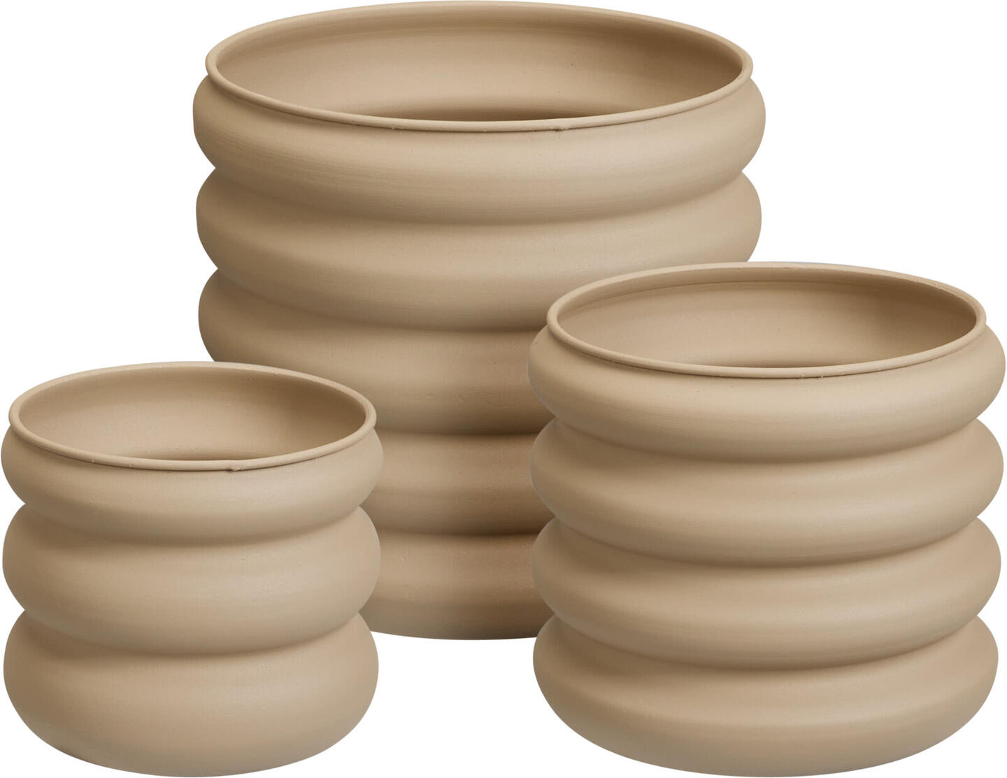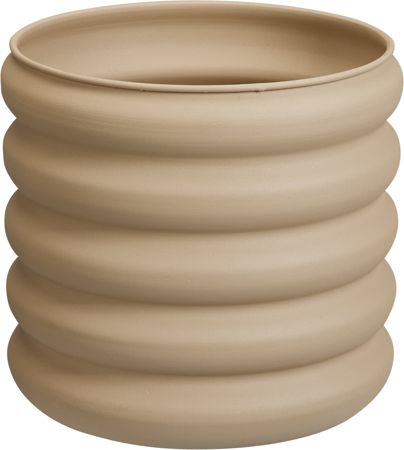 Mahukas beeži tooniga lillepott on ümara kujuga ja väljendusrikka soonemustriga. Neutraalne värv ning selge vorm loovad terrassil või aias harmoonilise ja ajatu üldmulje. Pott on valmistatud tsingitud metallist ning mõeldud kasutamiseks välitingimustes.