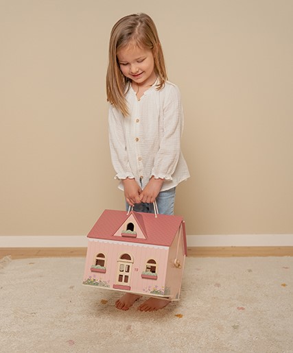 Kaasaskantavat nukumaja on mugav kõikjale kaasa võtta tänu tugevale käepidemele ning kompaktselt suletavale kujule. Roosades ja pastellsetes toonides kujundus, lillede ja akendega fassaad ning armsad kujukesed loovad soojalt kutsuva mängumaailma.