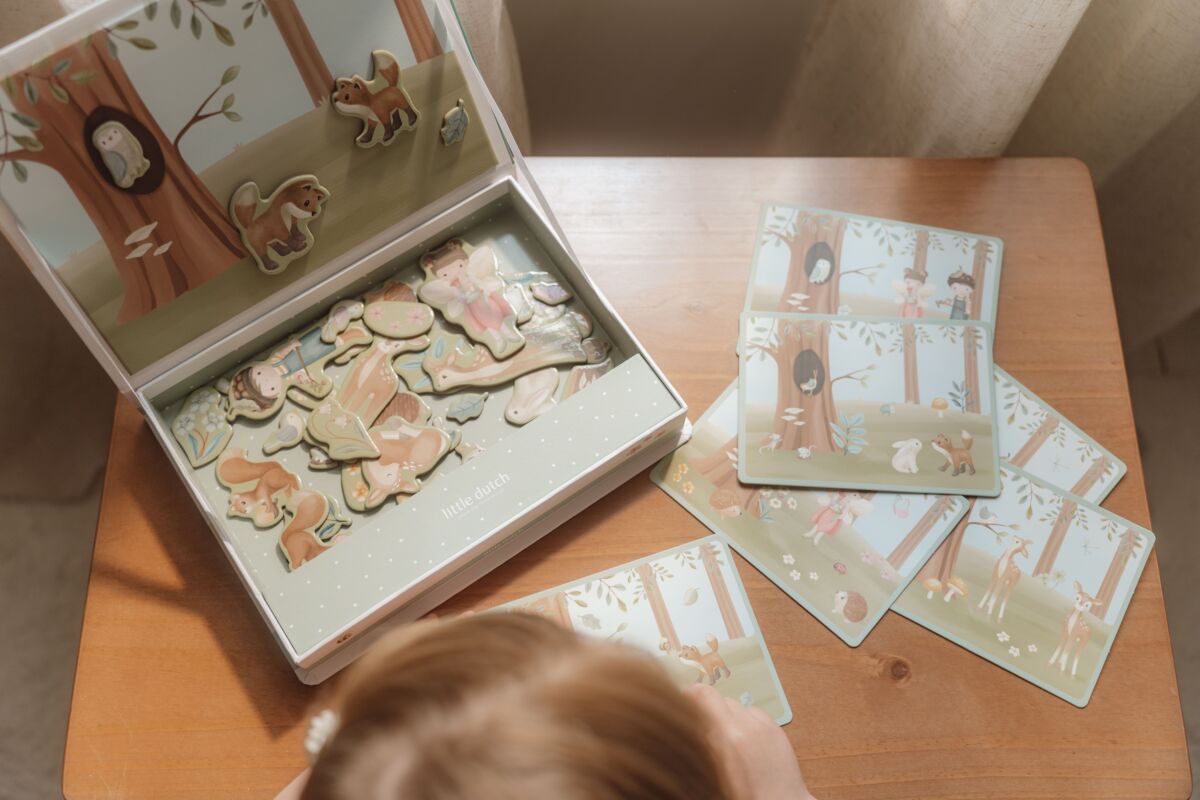 Little Dutch´i magnetpusle “Forest Friends” viib lapse lummavasse metsa, kus ootavad armsad loomad, haldjad ja seened. Magnetilise mängulaua abil saab kaartide järgi pilte kokku panna või ise uusi stseene välja mõelda – võimalusi on lõputult. Loominguline mäng arendab loovust, sõnavara ja peenmotoorikat.