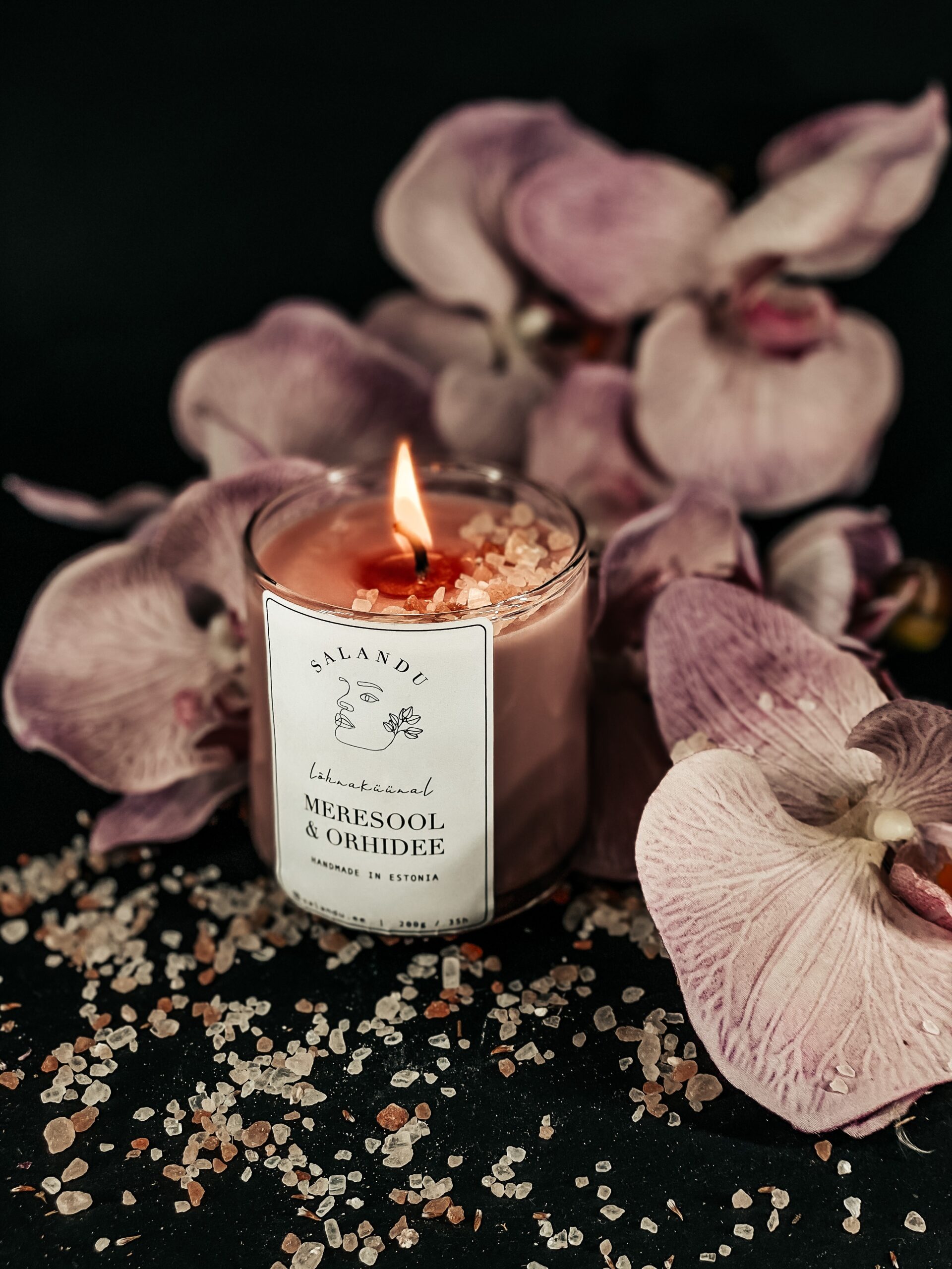Meresool ja orhidee küünal on roosa tooniga ning küünlal on peal kaunistused mis teeb selle suurepäraseks kingiks.