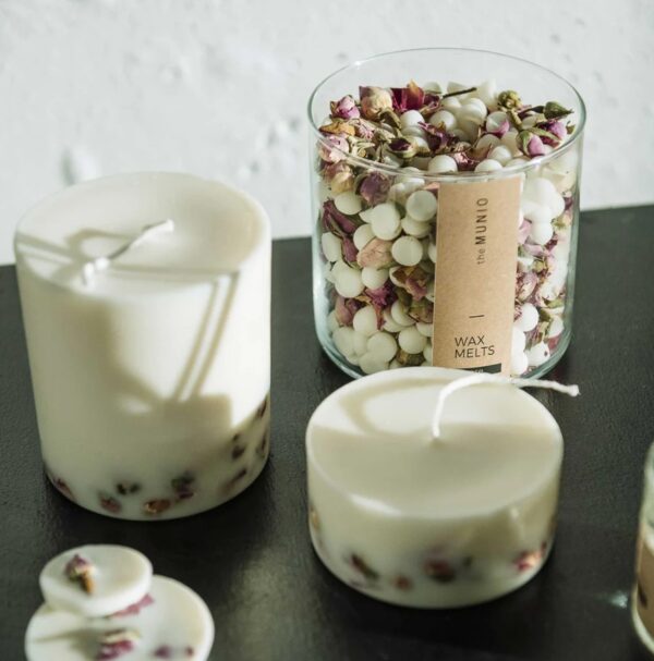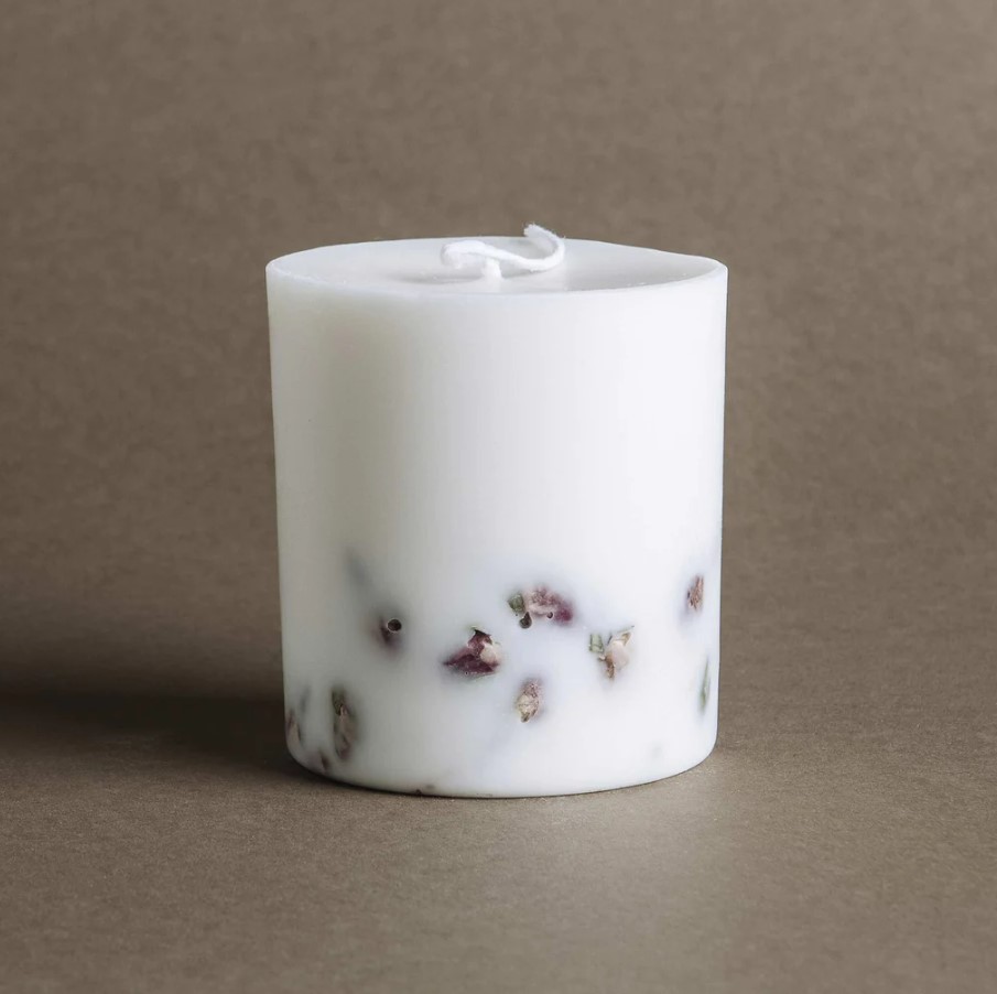 Käsitsi valatud sojavahast sammasküünal, mis on kaunistatud roosiõitega Läti aedadest.