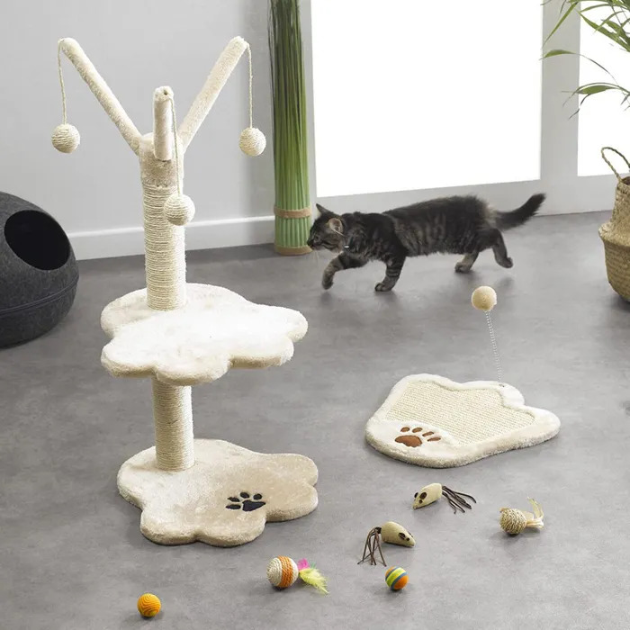 Kraapimispind on kaetud vastupidava sisaliga, mis sobib hästi küünte hooldamiseks. Pehme plüüsiga ääristatud alus pakub mugavat kohta lamamiseks ning vedruga kinnitatud pom-pom mänguasi kutsub kassi mängima ja liikuma.