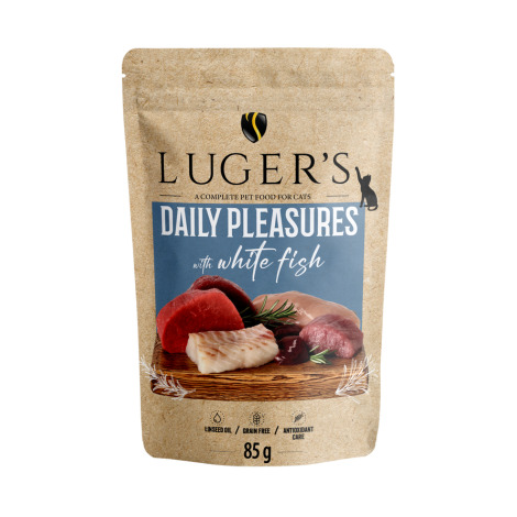 Luger’s Daily Pleasures märgtoit kassile valge kalaga on täisväärtuslik ja tasakaalustatud märgtoit täiskasvanud kassidele kõikidest tõugudest, sobides igapäevaseks toitmiseks ka tundliku seedimisega kassidele. Retsept vastab kaasaegsetele toitumisstandarditele ning katab 100% täiskasvanud kassi toitainevajadusest.