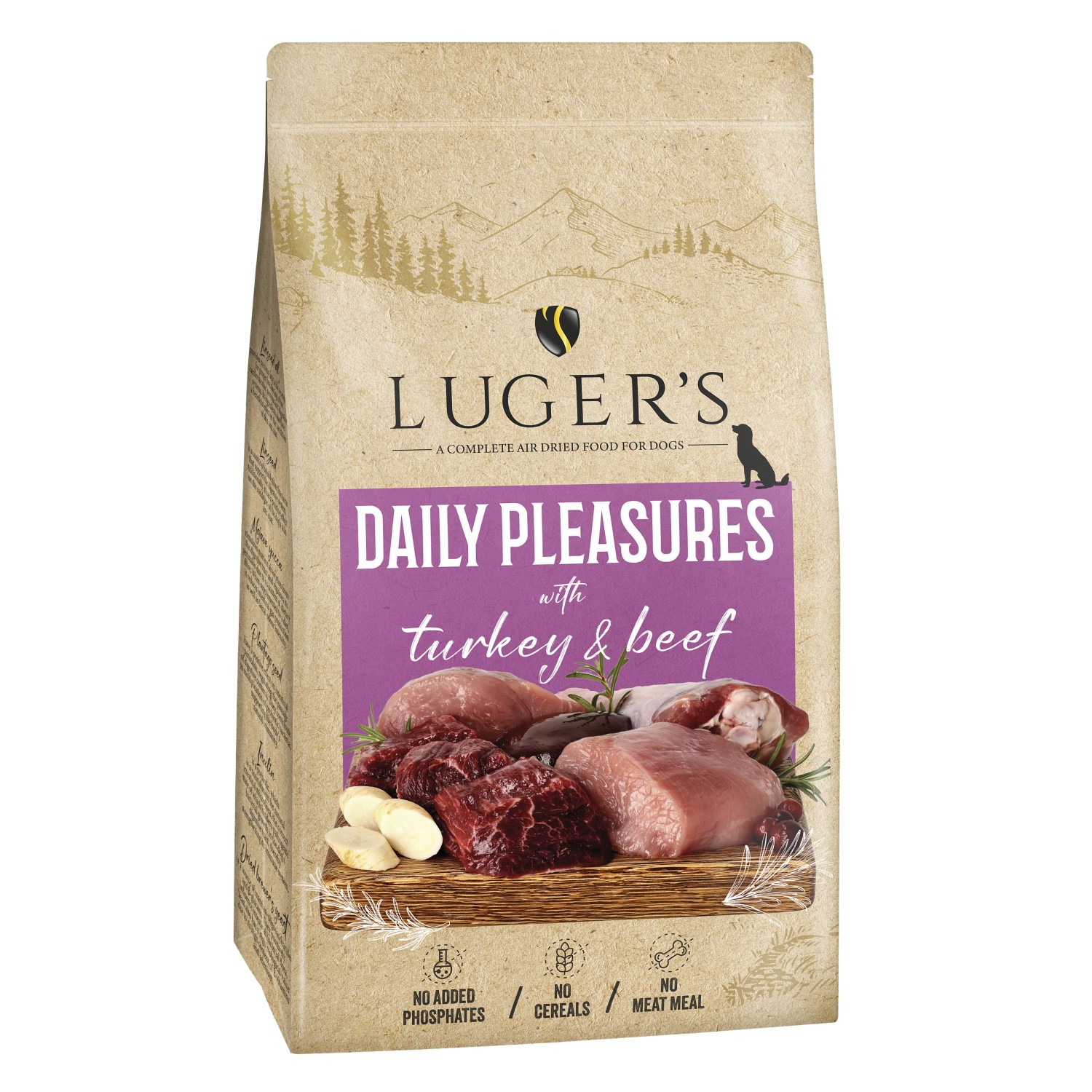 Lugers Daily Pleasures õhkkuivatatud toit kalkuni ja veisega on kõrge lihasisaldusega (80%), teraviljavaba ning kergesti seeditav täisväärtuslik sööt täiskasvanud koertele. Õrn õhkkuivatamise protsess säilitab liha, köögiviljade ja marjade loomulikud toitained, pakkudes maitsvat ja tasakaalustatud toidukorda kõigile tõugudele.