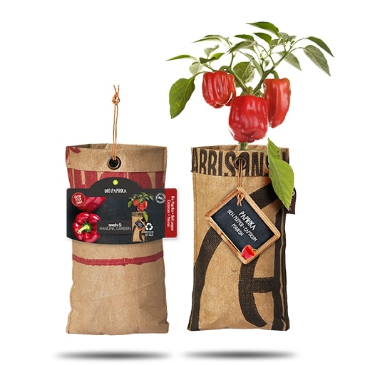 Riputatavas kasvatuskoti komplektis on riputusaasaga kasvatuskott, kasvusubstraat ja magusa paprika ‘Bio Bell Pepper’ seemned.
