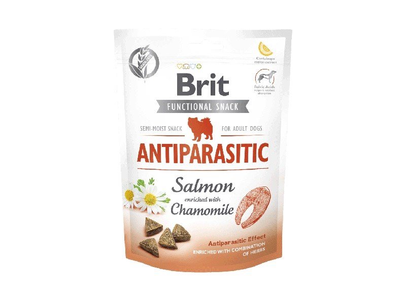Brit Care funktsionaalne lõhe ja kummeliga maius parasiidivastase toimega. Täiendsööt koertele.