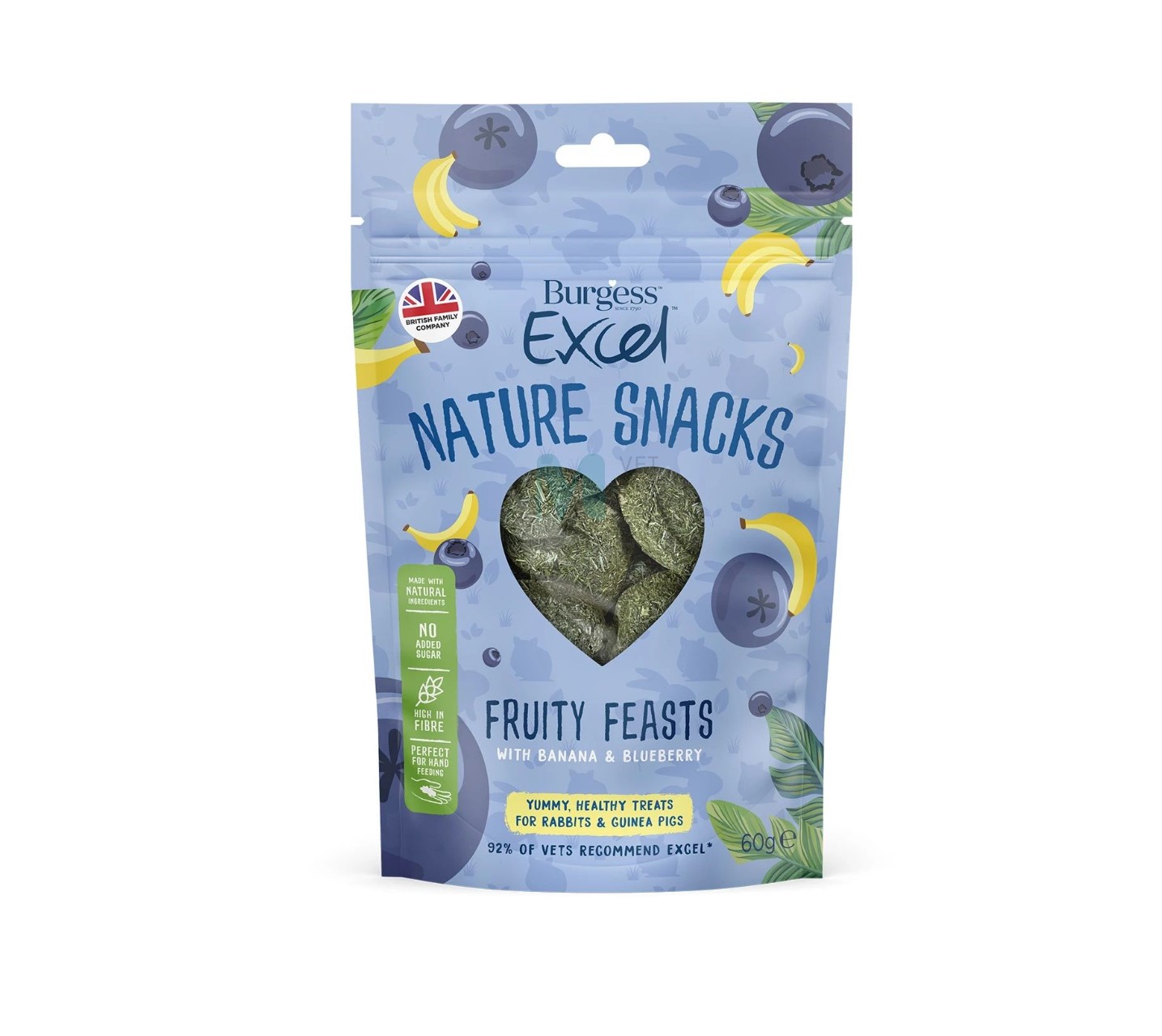 Burgess Excel väikelooma maius Fruity Feasts banaani ja mustikatega. Täiendsööt küülikutele ja merisigadele. Küpsetatud maitsvad maiused, millele ei ole lisatud suhkruid, kunstlikke värv- ega maitseaineid. Fruity Feasts snäkid on kõrge kiudainesisaldusega ja valmistatud looduslikest koostisainetest.
