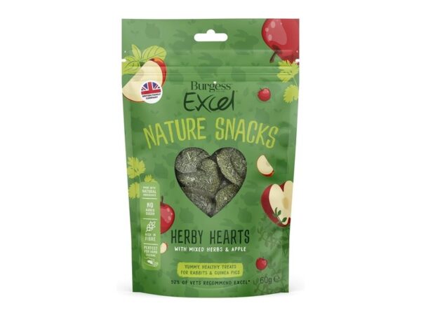 Burgess Excel väikelooma maius Herby Hearts ürtide ja õunaga 60g. Täiendsööt küülikutele ja merisigadele. Küpsetatud maitsvad maiused, millele ei ole lisatud suhkruid, kunstlikke värv- ega maitseaineid. Herby Hearts snäkid on kõrge kiudainesisaldusega ja valmistatud looduslikest koostisainetest.