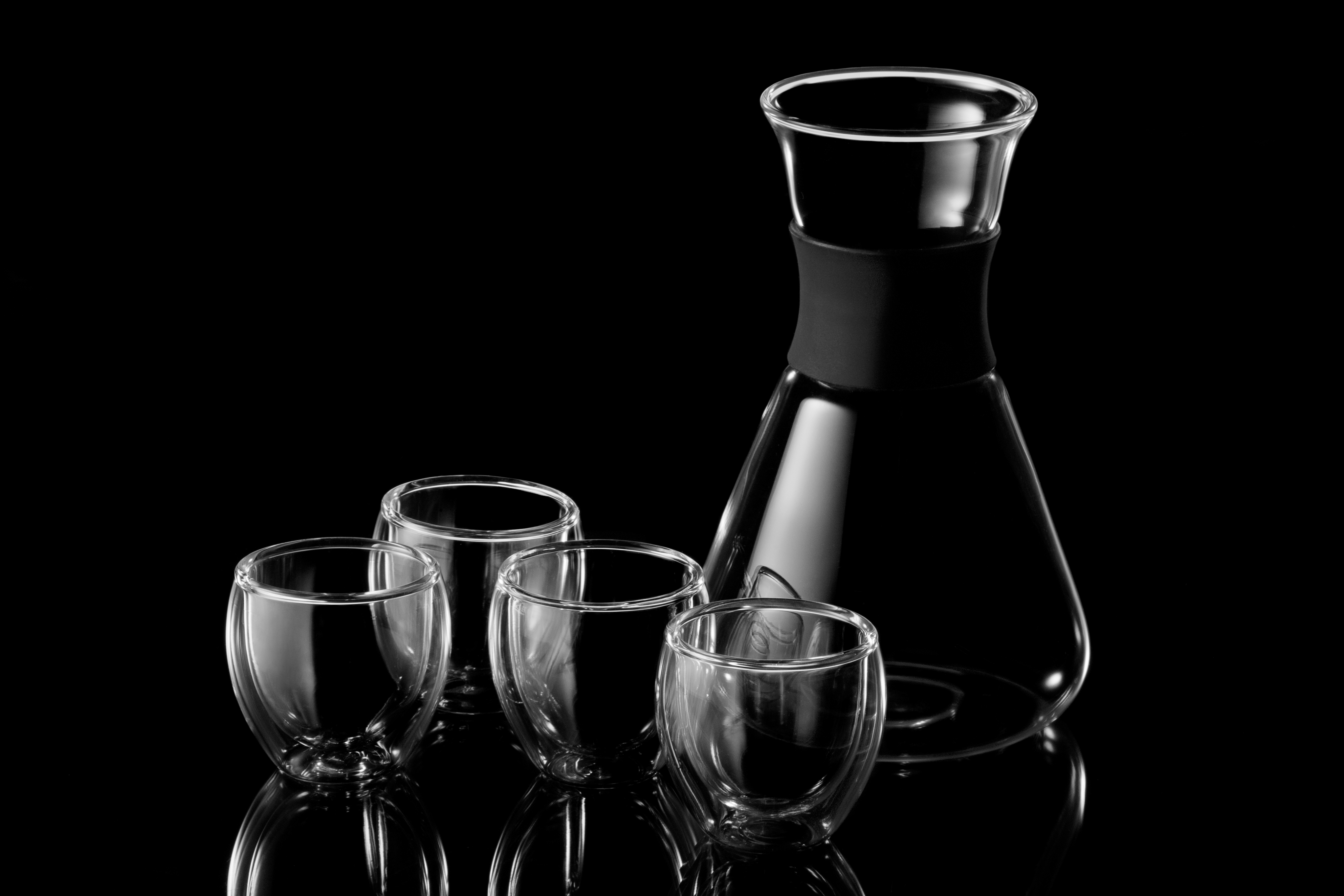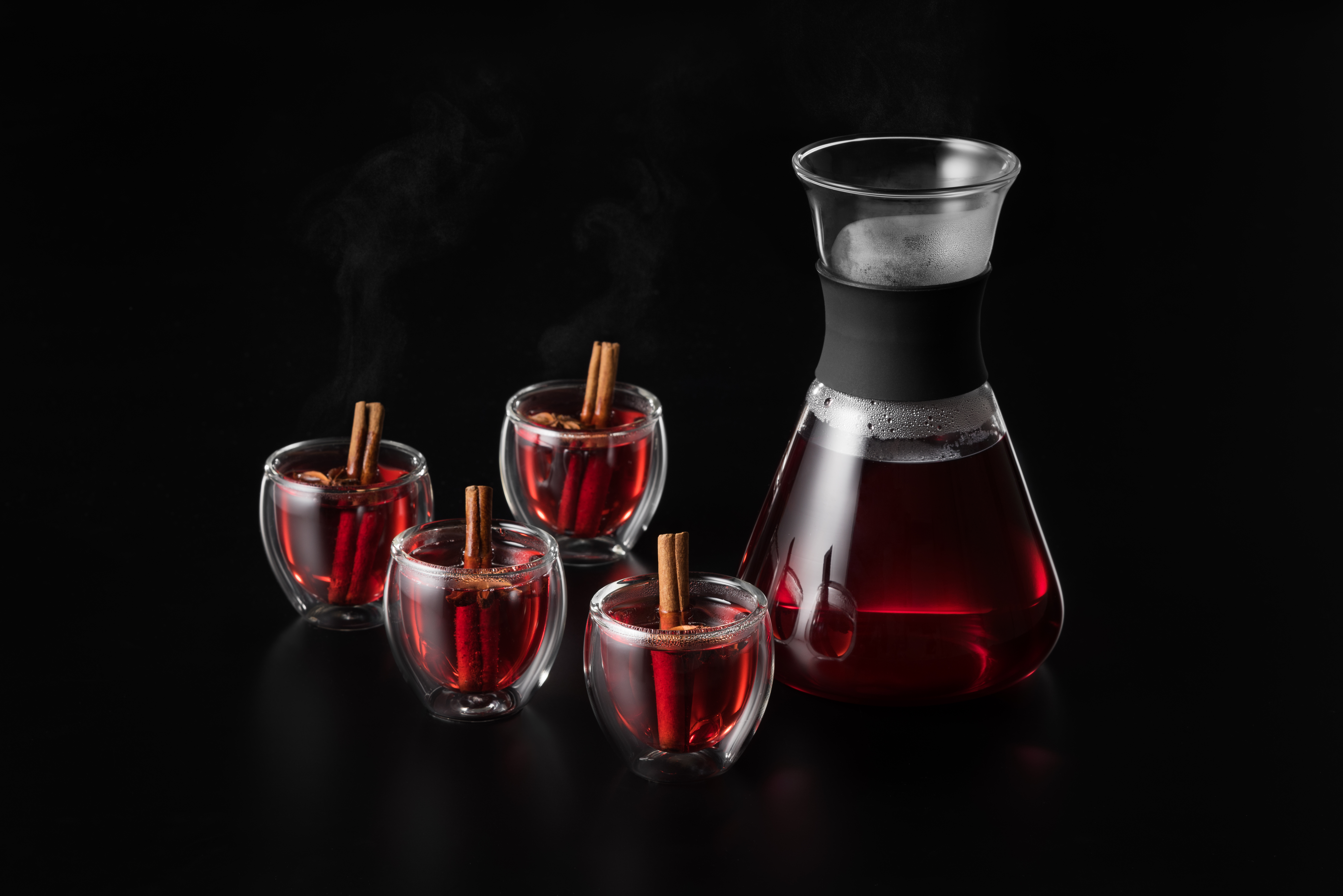 Kauni kujuga karahvin ja kahekordse seinaga kuumakindlad joogiklaasid lisavad teie talvisele hõõgveinipeole stiili.