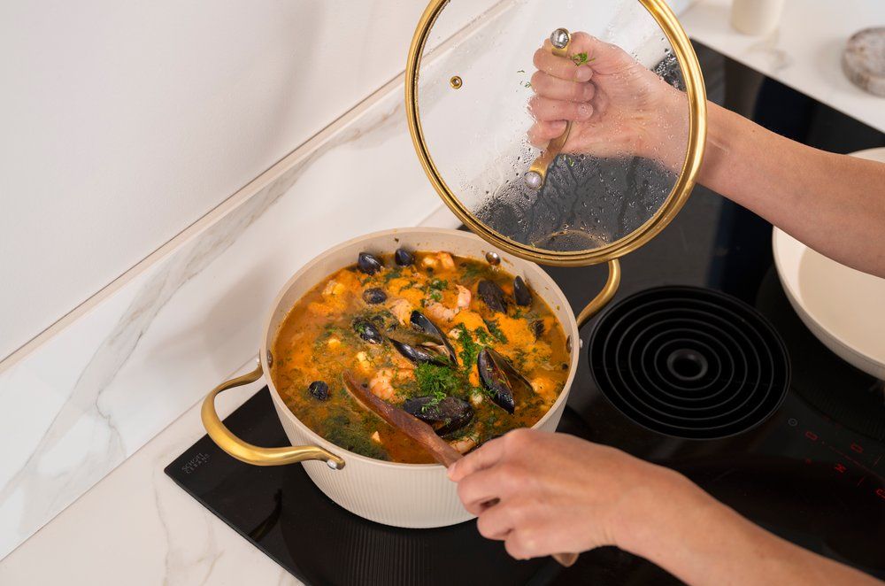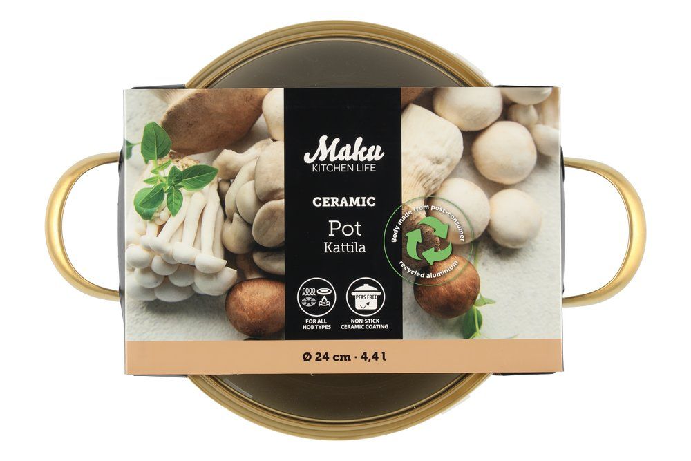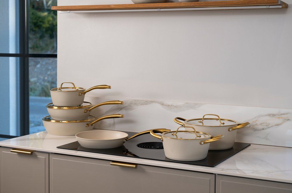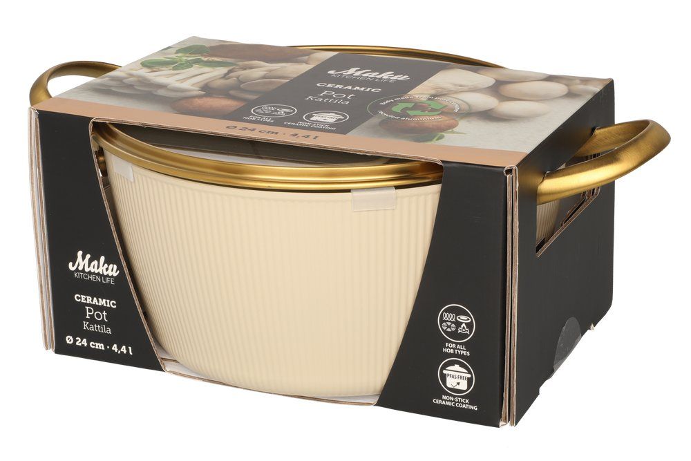 Beež keedupott ühendab endas vastupidavuse ja läbimõeldud disaini. Sepistatud alumiiniumist korpus tagab kiire ja ühtlase soojusjaotuse, samas kui keraamiline mittenakkuv Greblon-kate võimaldab tervislikku toiduvalmistamist vähese rasvainega ning muudab puhastamise lihtsaks. Potil on dekoratiivne ribiline välispind ja kuldsed roostevabast terasest käepidemed. Komplekti kuulub auruavaga klaaskaas, mis võimaldab toiduvalmistamise protsessi jälgida ilma kaant kergitamata.