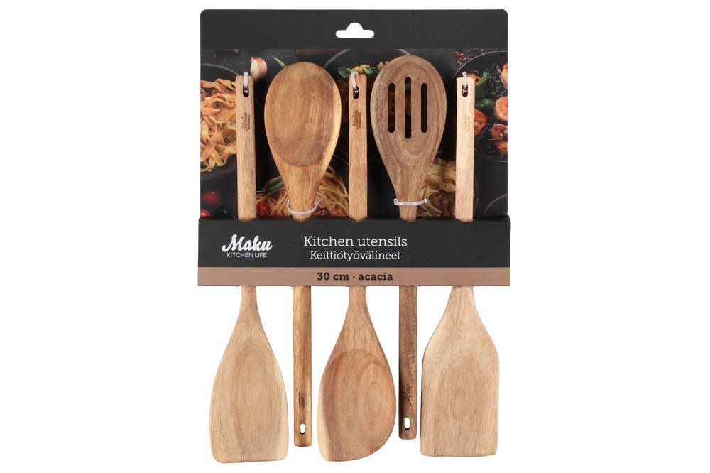 Maku 5-osaline köögitarvikute komplekt on valmistatud kvaliteetsest akaatsiapuust ning sobib igapäevaseks toiduvalmistamiseks. Puidust tarvikud on õrnad pottide ja pannide suhtes ega kahjusta mittenakkuvaid pindu, aidates pikendada nõude kasutusiga. Looduslik akaatsiapuit paistab silma kauni värvitooni ja omanäolise puidusüüga, lisades interjöörile sooja ning elegantse ilme.