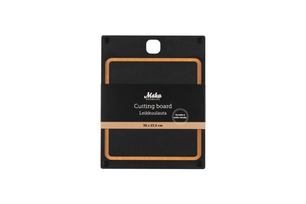 Maku lõikelaud on valmistatud vastupidavast ja noasõbralikust paberikomposiidist, mis talub igapäevast kasutust ilma kergesti kulumata. Silikoonist libisemisvastased täpid hoiavad laua lõikamisel kindlalt paigal ning ülaosas olev avaus võimaldab seda mugavalt riputada. Lõikelaud on kuumuskindel kuni 175 °C ja sobib pesemiseks nõudepesumasinas.