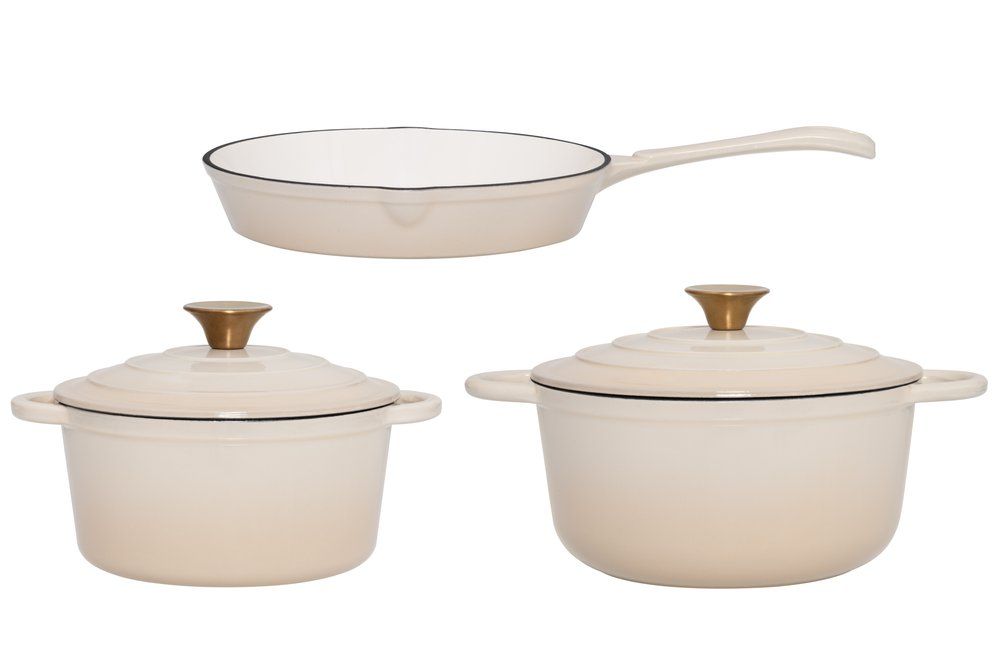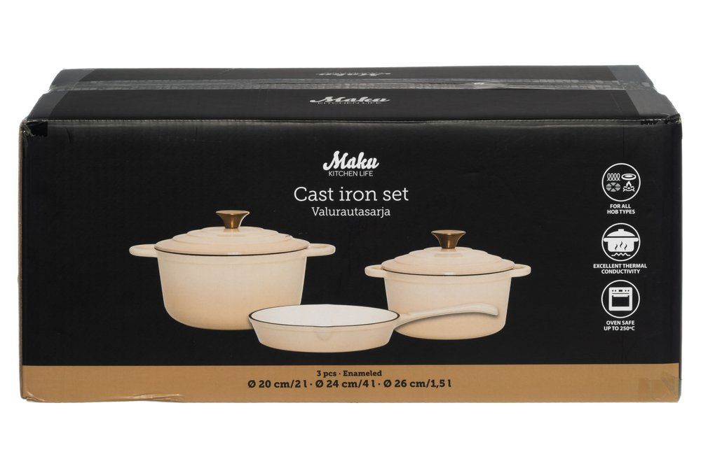 Maku malmist nõude komplekt on praktiline kolmeosaline lahendus, kuhu kuuluvad kaks kaanega potti ja vastupidav praepann. Emailitud malm on hinnatud oma suurepärase soojussalvestuse ja ühtlase jaotuse poolest, tagades mahlase ja täiusliku küpsetustulemuse. Need mitmekülgsed kööginõud sobivad kasutamiseks kõikidel pliitidel, sealhulgas induktsioonil, ning on kuumuskindlad ahjus kuni 250 °C.
