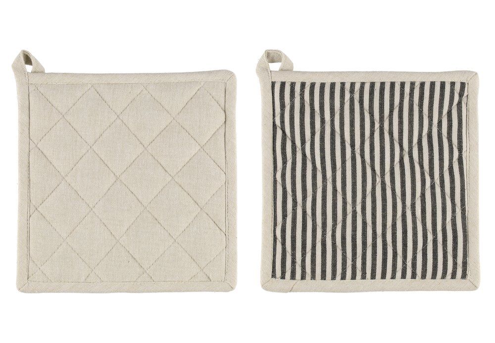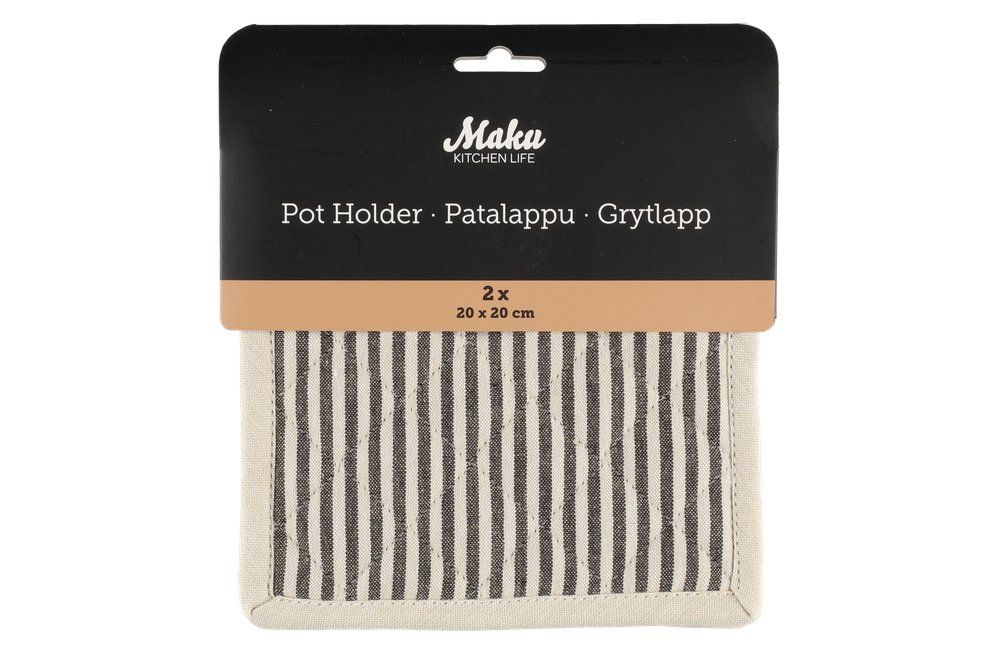 MAKU pajakinnaste komplekti kuulub kaks 20 × 20 cm suurust pajakinnast. Üks kinnas on ühtlaselt liivakarva, teine musta-hallikirju triibumustriga. Pajakindad on valmistatud orgaanilisest puuvillast ning sobivad kuumade nõude käsitsemiseks köögis.