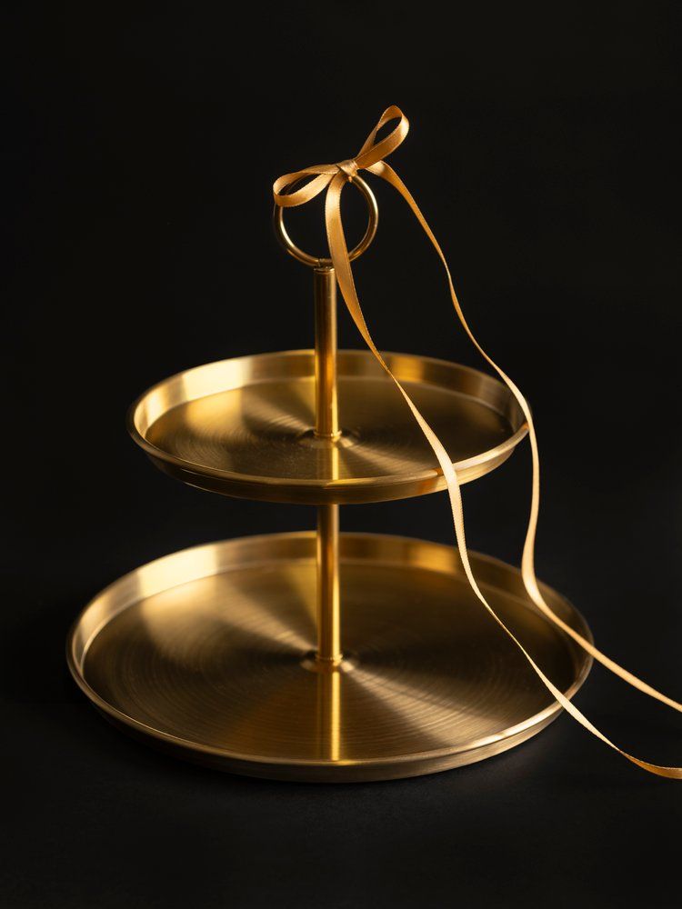 Kahe tasandiline kuldne serveerimisalus on luksus igasse hetke, Stiilne kahe tasandiline kuldne serveerimisalus toob lauale sära ja elegantsi. Kauni viimistlusega serveerimisalus on ideaalne valik nii pidulikeks sündmusteks kui ka igapäevasteks hetkedeks, lisades igasse interjööri luksusliku puudutuse.