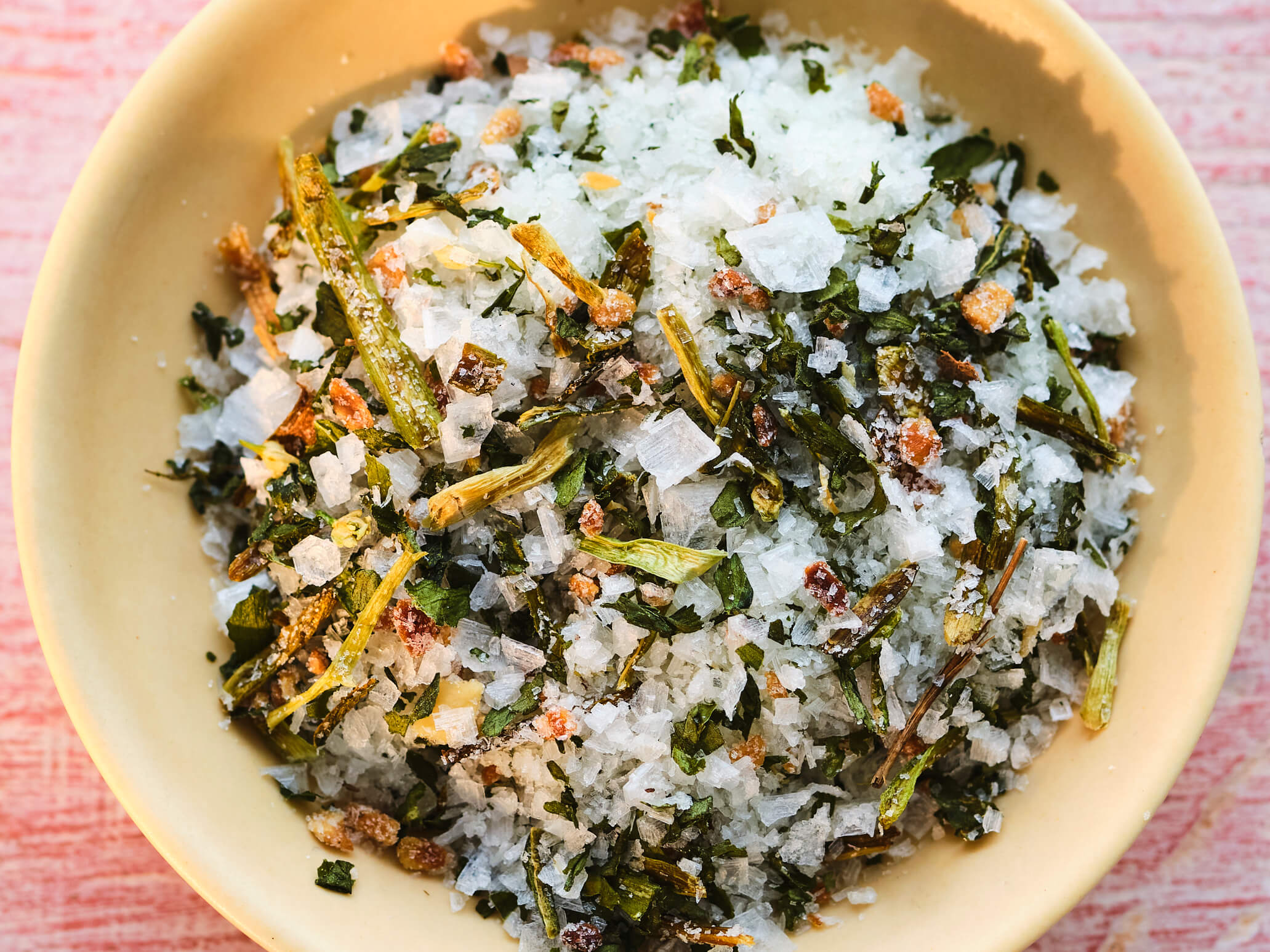 Koostis: meresoola helbed (94%), kuivatatud kaurulauk (3%), röstitud küüslauk (3%)