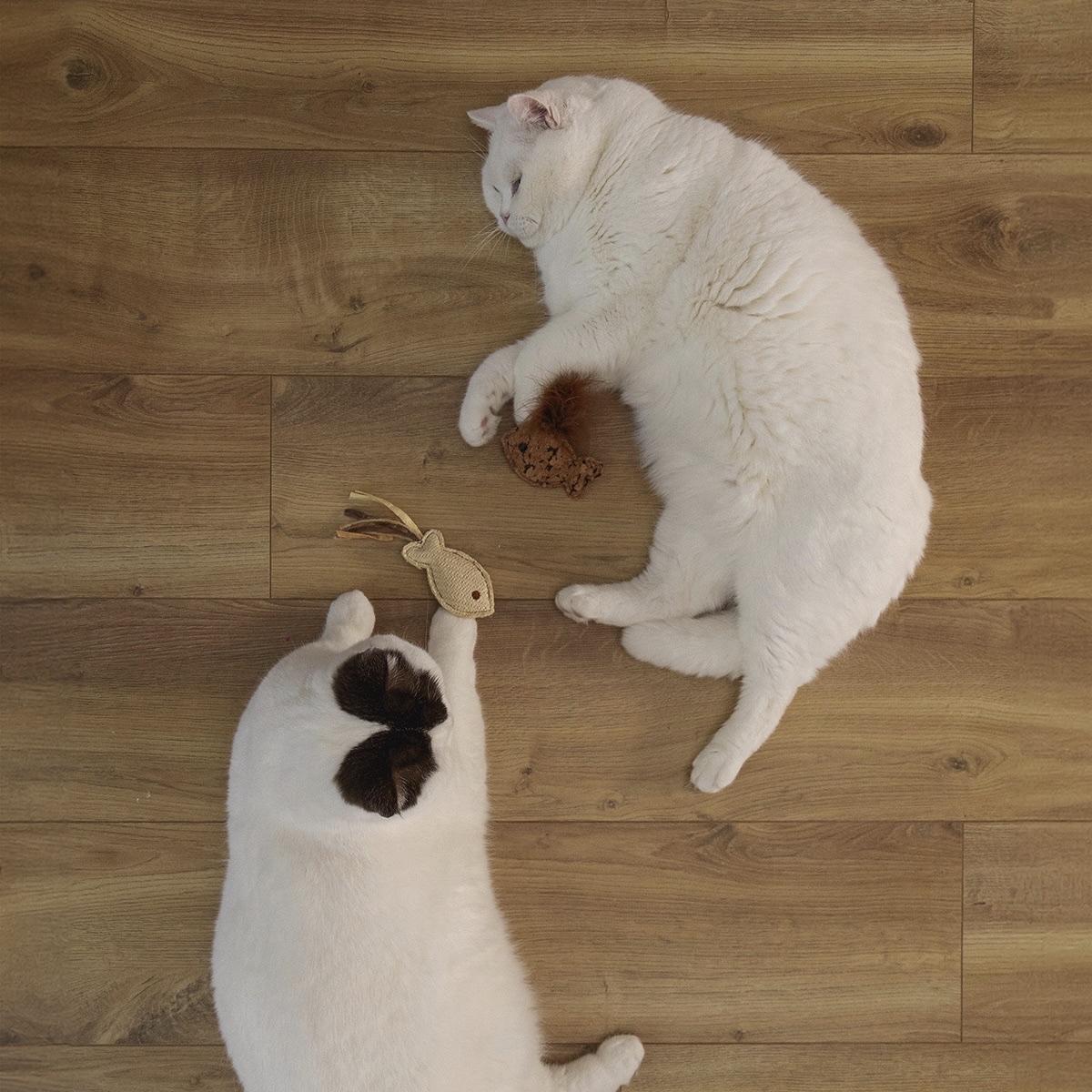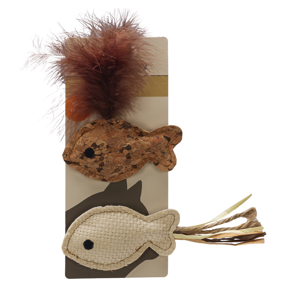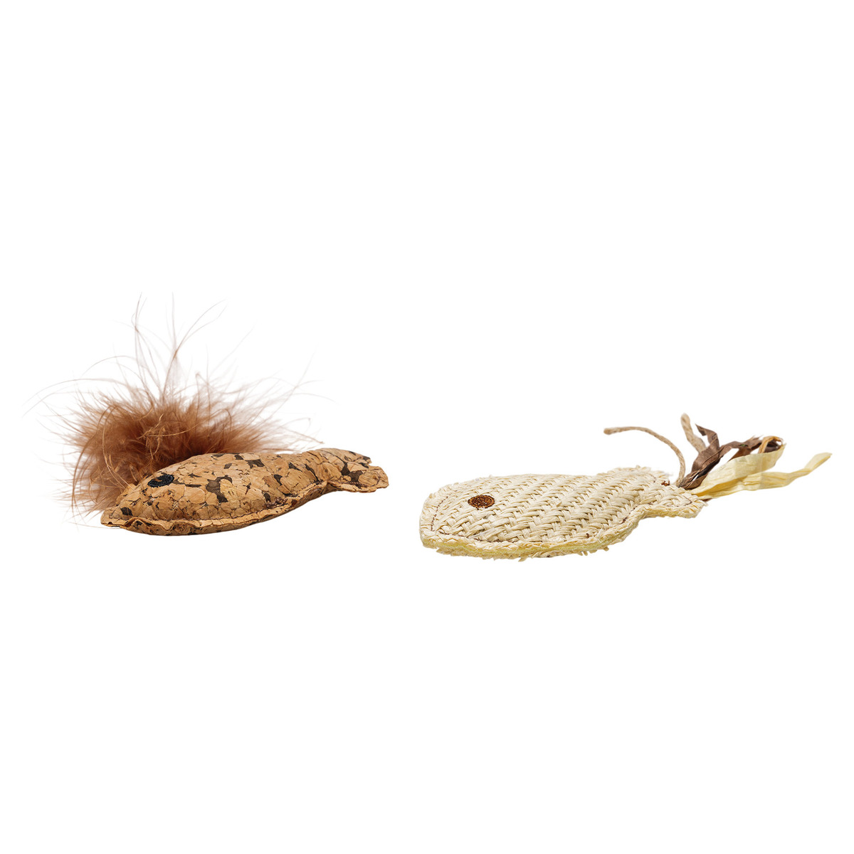 Esemetel on erinevad detailid, mis muudavad tegevuse mitmekesisemaks: ühte kala ehib raffiakaunistus, teist aga suleline saba. Pehme ja kerge materjal võimaldab loomal mänguasju hõlpsalt haarata, kanda ning liigutada.