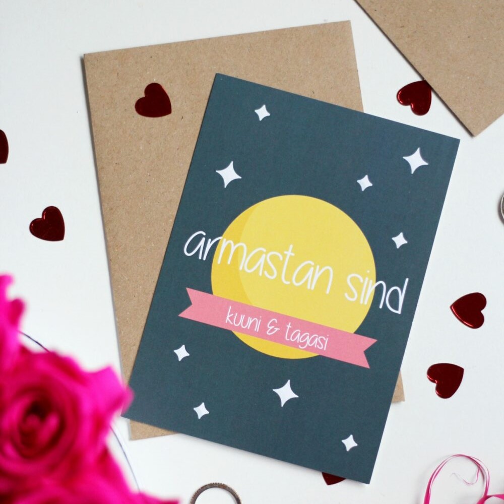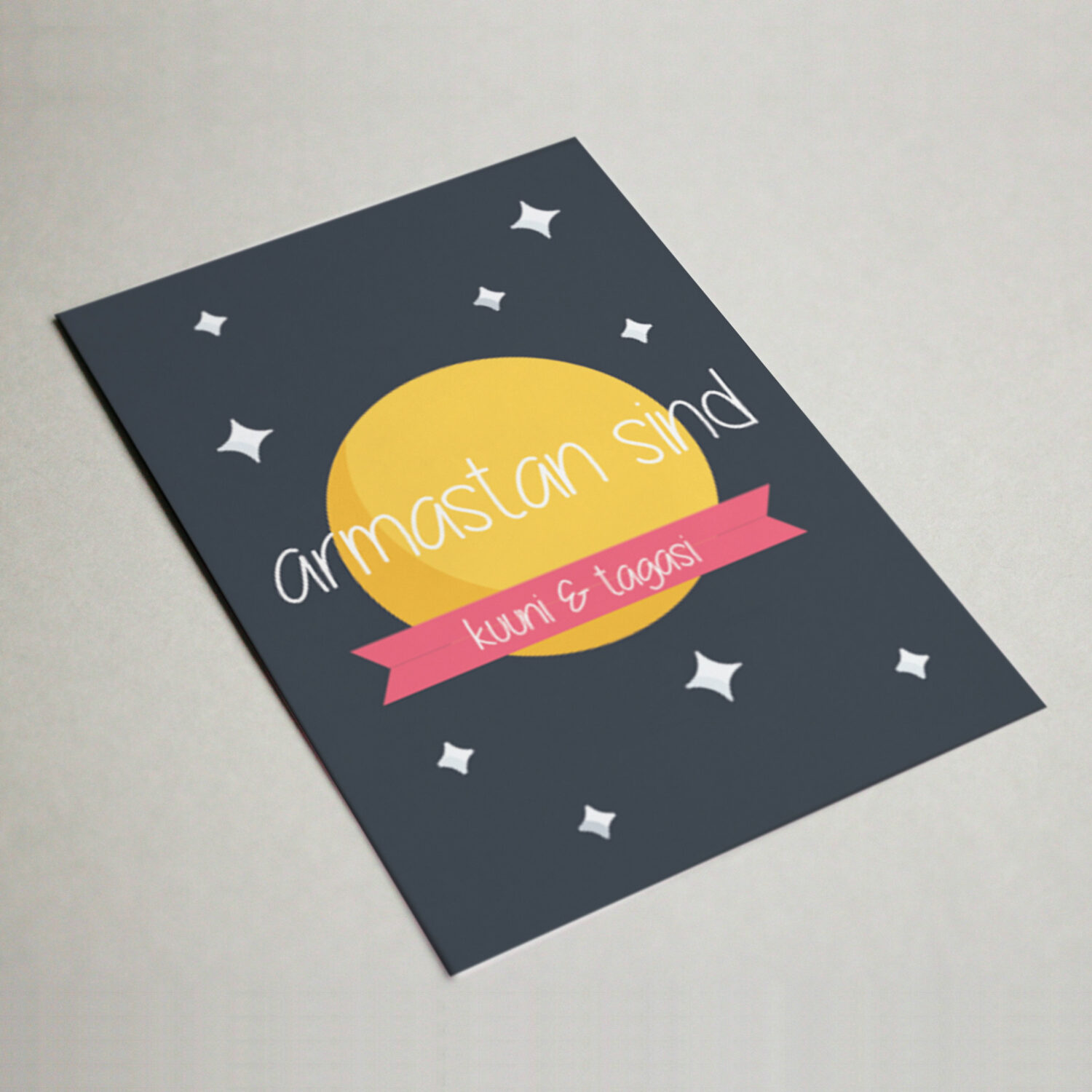 Õnnitluskaart „Armastan sind kuuni ja tagasi“. Sõnum, mis ütleb rohkem kui tuhat sõna. Volditav postkaart sobib kinkimiseks kõige kallimale – olgu see partner, pereliige või hea sõber. Kujundusel olev päikesekollane kuu ja lihtne, armas sõnum loovad sooja tunde, mis kestab kauem kui üks tähtpäev.