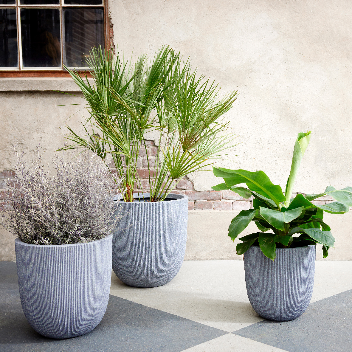 Lennox plastikust silindrikujuline õuepott on loodusliku ilmega ja soonilise disainiga