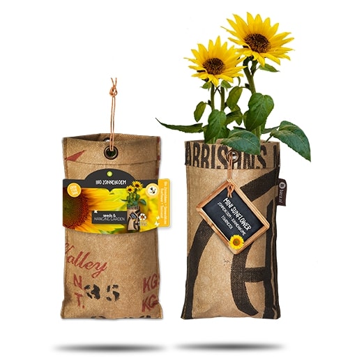 Päevalill riputatavas kasvatuskotis komplektis on riputusaasaga kasvatuskott, kasvusubstraat ja päevalille seemned.