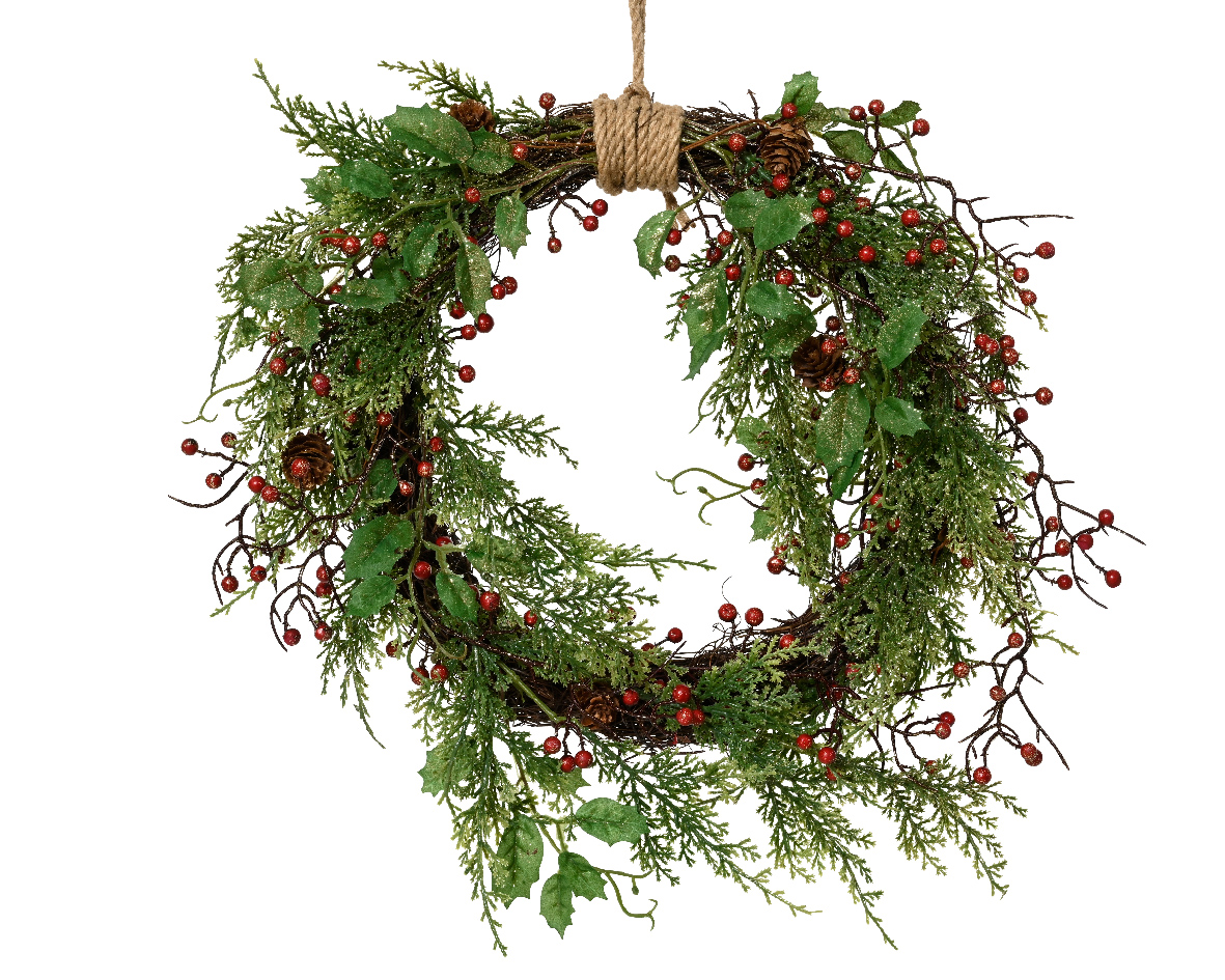 Roheline pärg kaunistatud punaste marjade, okaste ja väikeste käbidega loob klassikalise ja piduliku jõulumeeleolu. Naturaalsust meenutavad detailid ja õrn sädelus teevad pärjast kauni aktsendi uksele, seinale või aknale.