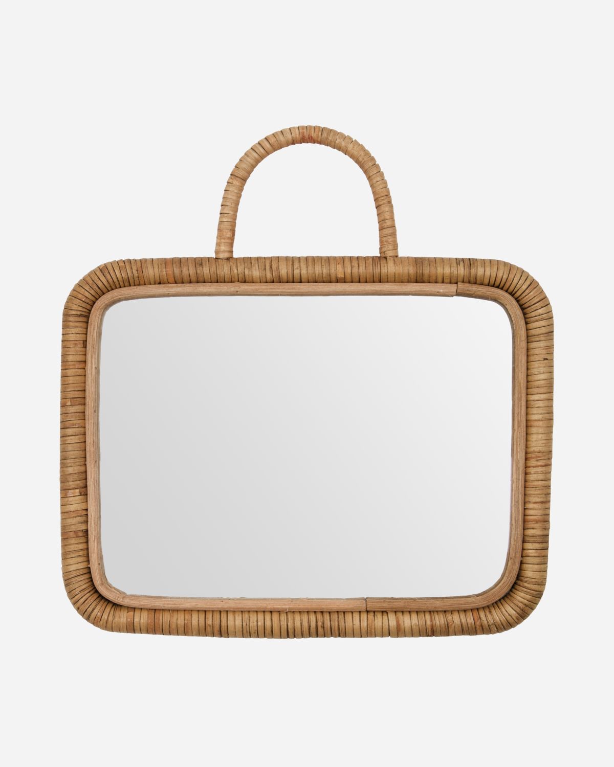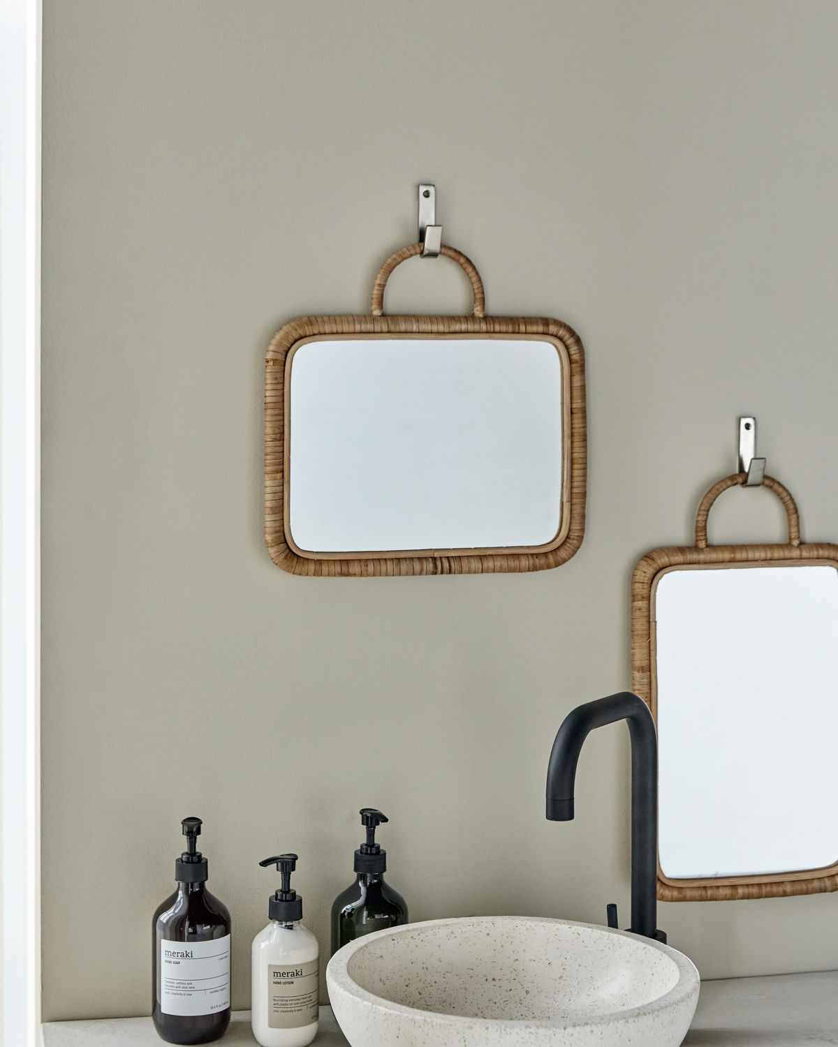 Meraki peeglil on rotangist punutud äär, naturaalne materjal on pehme kontrast marmorile ja keraamikale.