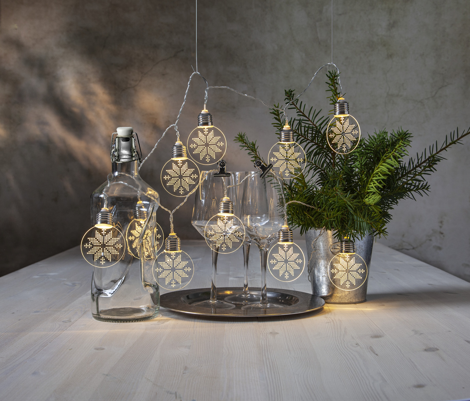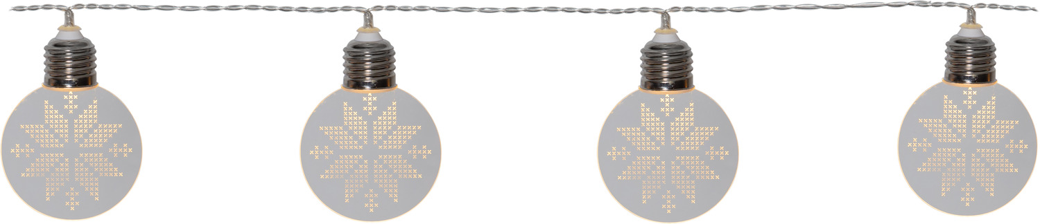 Dekoratiivne valguskett 10 õhukese akrüülkupliga, millel on laseriga lõigatud lumehelbemuster. Kuplid lasevad sooja valge valguse õrnalt läbi, luues kauni mustrieffekti. Sobib hästi siseruumidesse, näiteks aknale, riiulile või kuusekaunistuseks. Valgusti töötab patareidel ning sisaldab mugavat taimerit, mis lülitab tule automaatselt 6 tunniks sisse ja 18 tunniks välja.