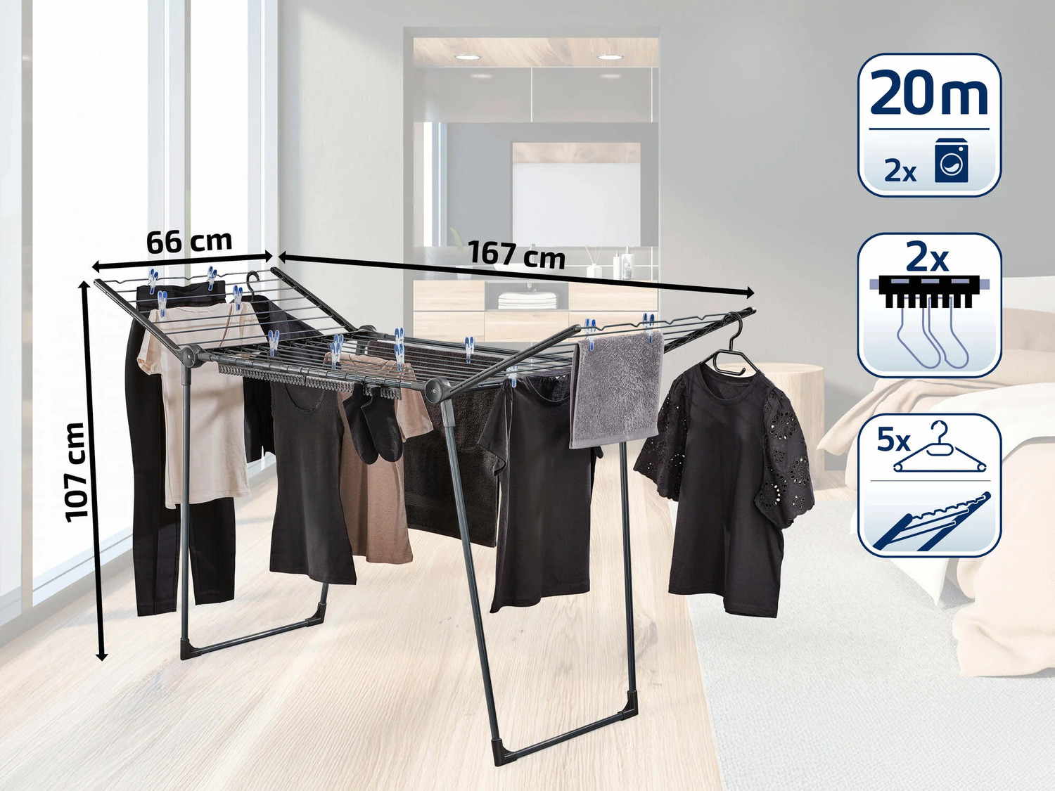 Kuivatusrest pakub kokku 20 meetrit kuivatuspinda, mis võimaldab kuivatada korraga kuni kaks pesumasinatäit pesu. Kõrged küljetiivad sobivad ideaalselt pikkadele esemetele, nagu püksid ja rätikud, ilma et need põrandat puudutaksid. Restiga on kaasas ka praktilised lisad, mis muudavad pesu kuivatamise veel mugavamaks.
