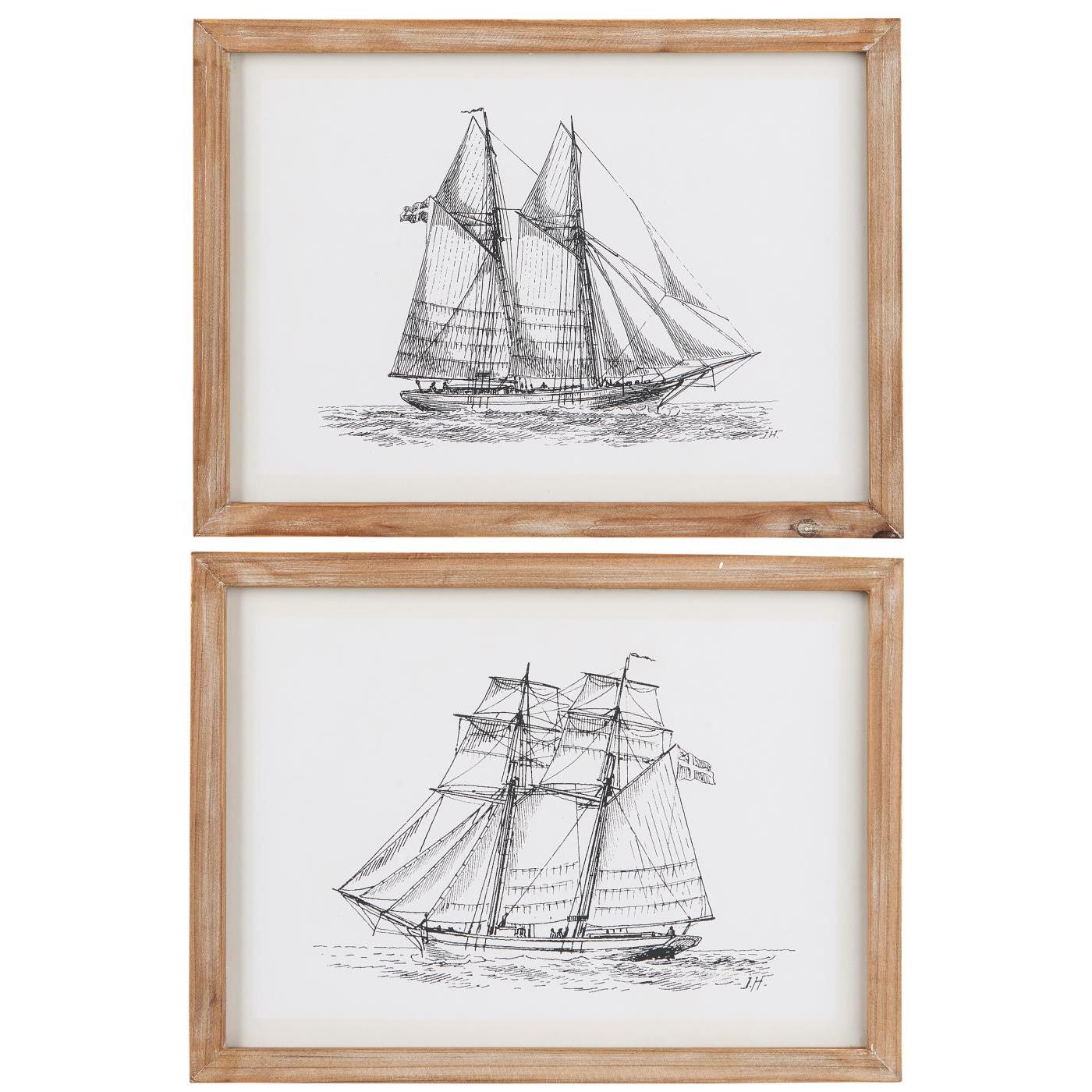 Kaunis kitsa männipuidust raamiga ja laevamotiiviga pilt, mis on valmis seinale riputamiseks.