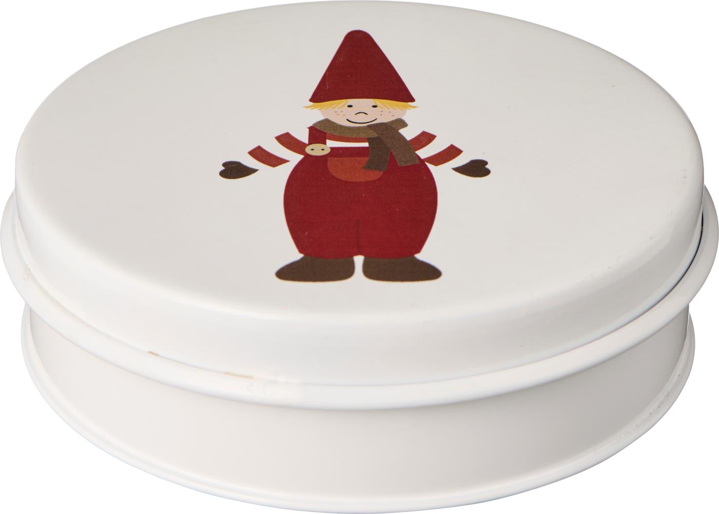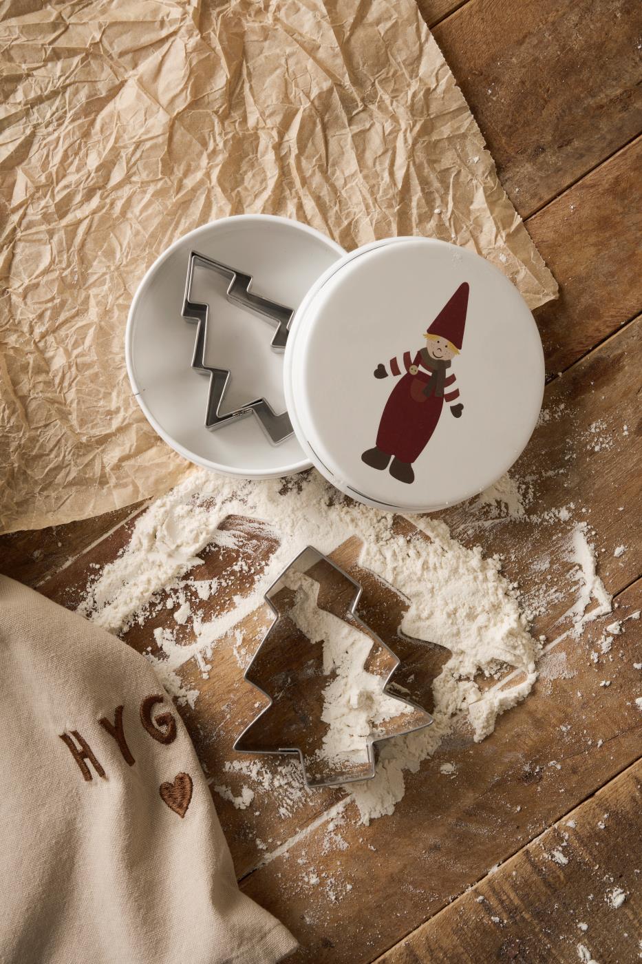 Metallist karbike jõuluteemalise kaanega. Karbis on kolm kuusekujulist piparkoogivormi.