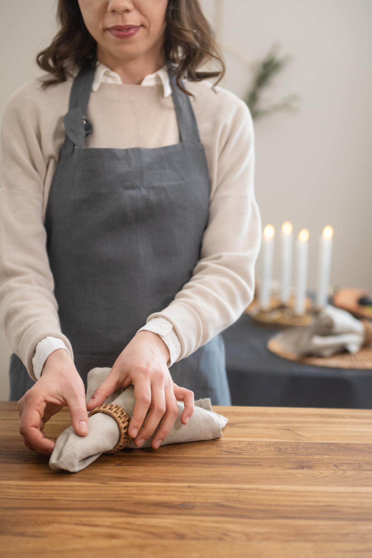 Põll on valmistatud 100% linasest materjalist. Põlle istuvust saab muuta hõlpsasti reguleeritava kaelarihma ja pikkade sidemetega, mida saab hõlpsasti muuta. Pestav 40 kraadi juures.