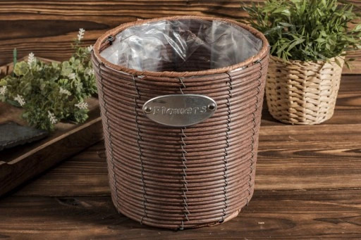 Punutud korv kile sisuga on metallraamile punutud tehnorattani ümbrispott, mis ühendab praktilisuse ja stiili. Kaunistuseks on metallist silt “Flowers” ning sisemus on vooderdatud kilekattega. Sobib ideaalselt dekoratiivseks elemendiks nii koju, aeda kui ka terrassile.