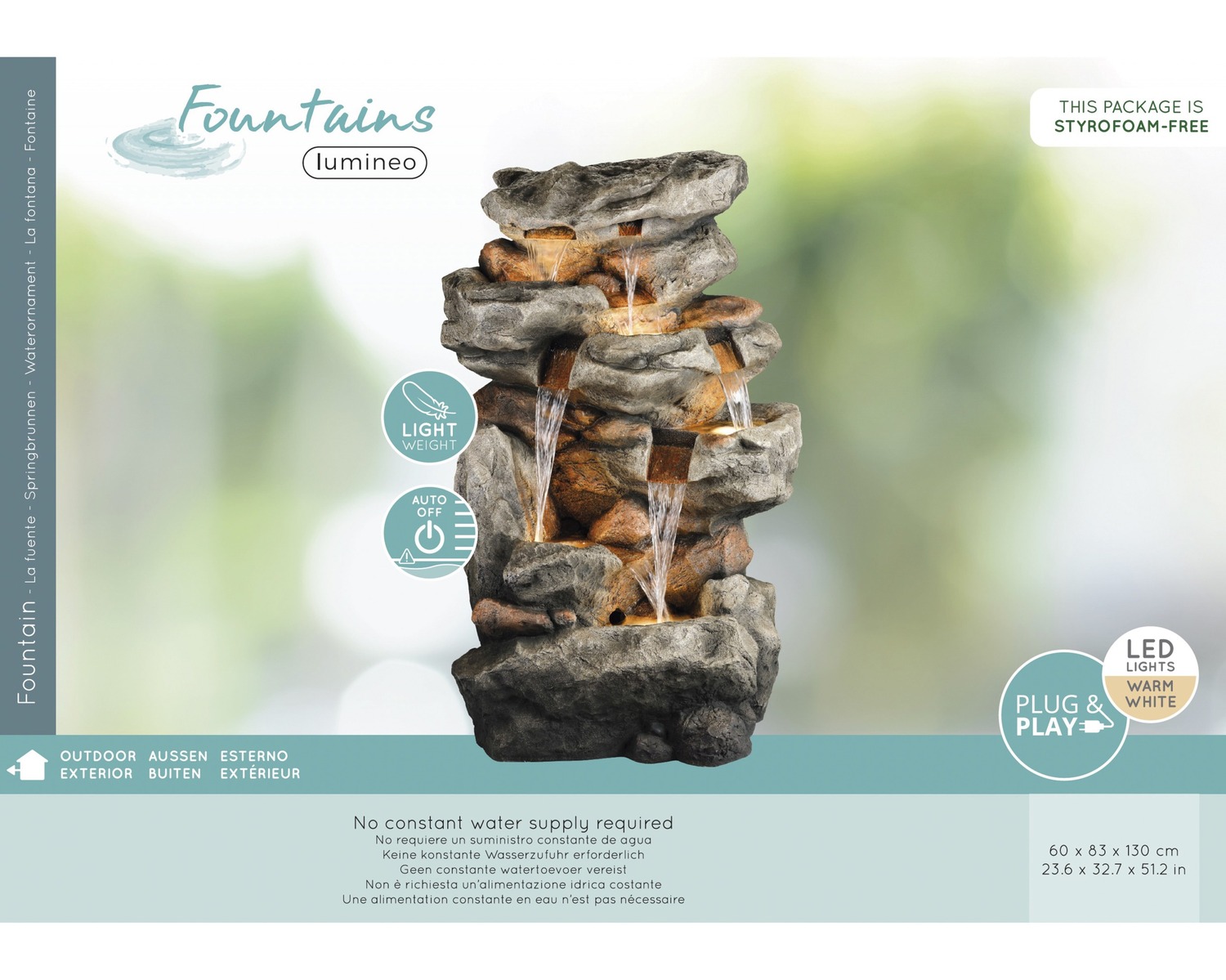 Lumineo kivikujundusega suur purskkaev on efektne pilgupüüdja aias, terrassil või hoovi keskpunktis. Mitmetasandiline kiviefektiga konstruktsioon suunab vee voolama ühelt tasandilt teisele, luues loomuliku ja rahustava veemängu. Soe LED-valgus tõstab voolava vee ja kivistruktuuri ka õhtuhämaruses kaunilt esile.
