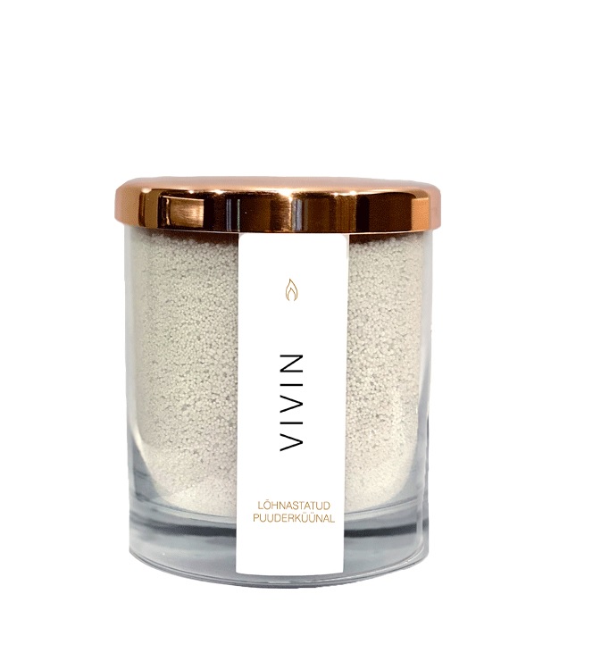 Puuderküünal on läbipaistvas klaasanumas(mõõdud 8x9cm). Puuderküünlad on lõhnastatud kõrgkvaliteetsete aroomiõlidega (mis omavad IFRA sertifikaati) ja valmisatud taimsest vahast – seetõttu ei eraldu põlemisel kahjulikke aineid ning põleb 60% puhtamalt kui teised küünlad, ei tahma ega tossa. See tõesti on nii hea! Käsitsi valmistatud Eestis.