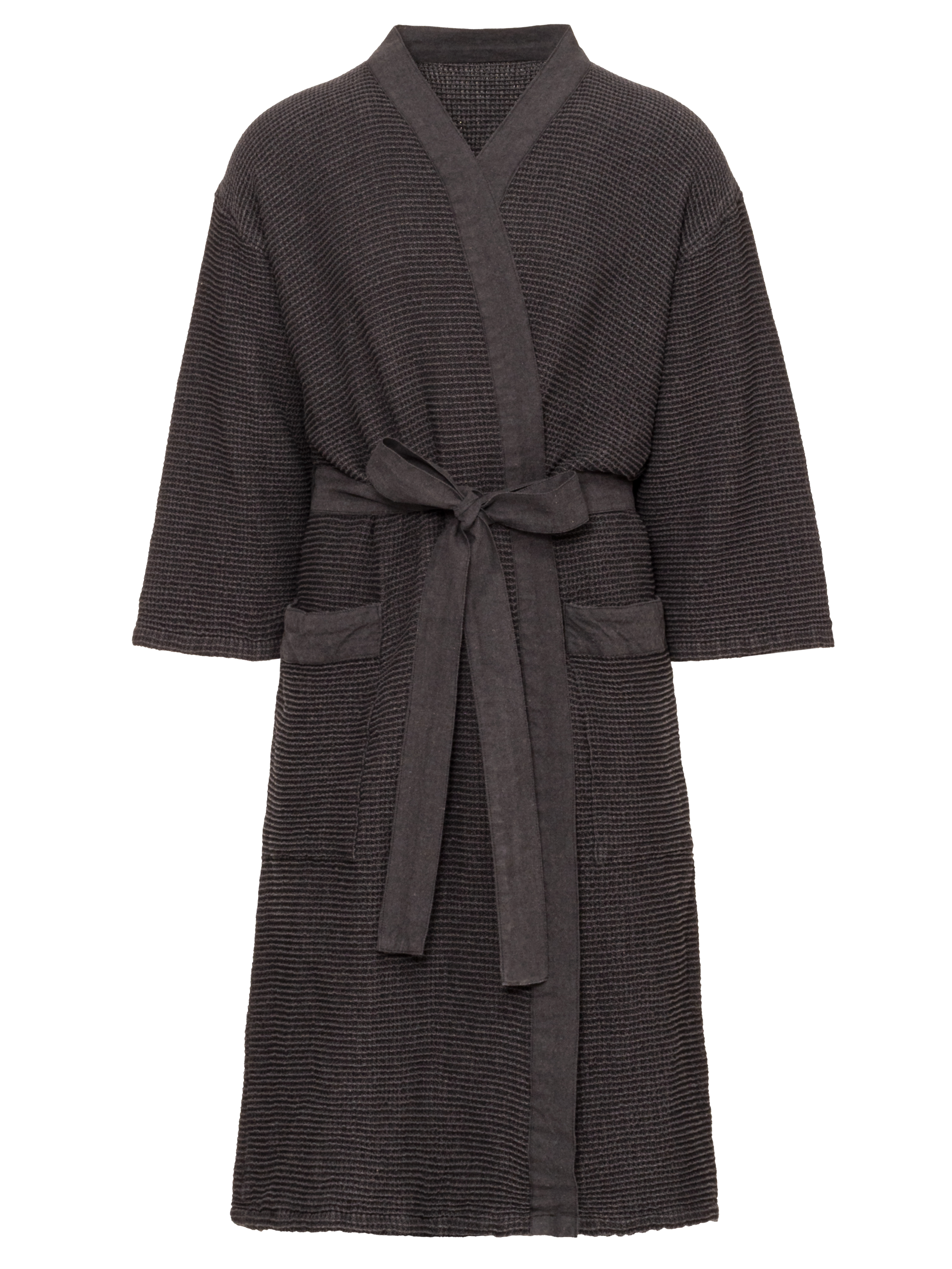 Mugav chambray ääriste ja vööga hommikumantel. Kenno saunatekstiilid on valmistatud taaskasutatud puuvillast, andes kangale loomuliku pehmuse ja särtsaka tekstuuri.