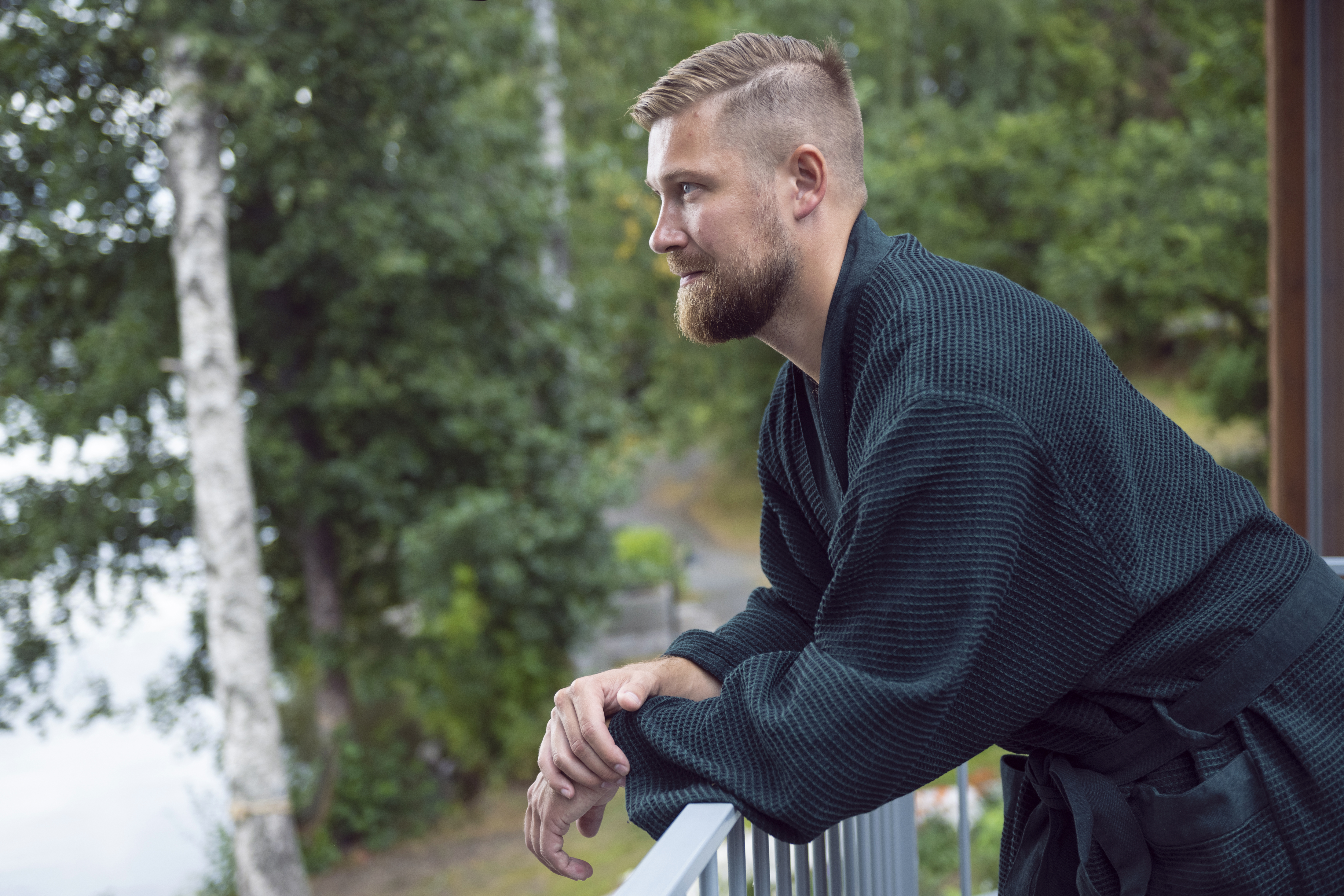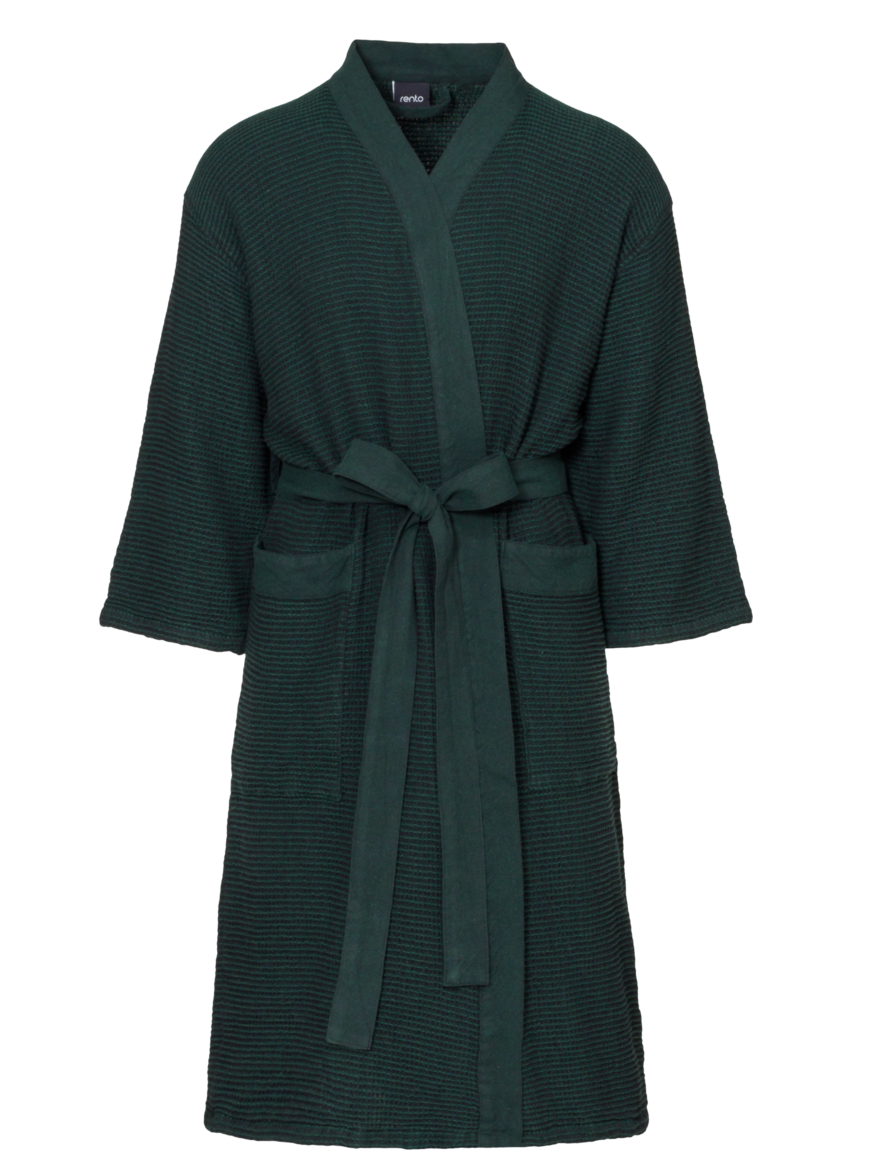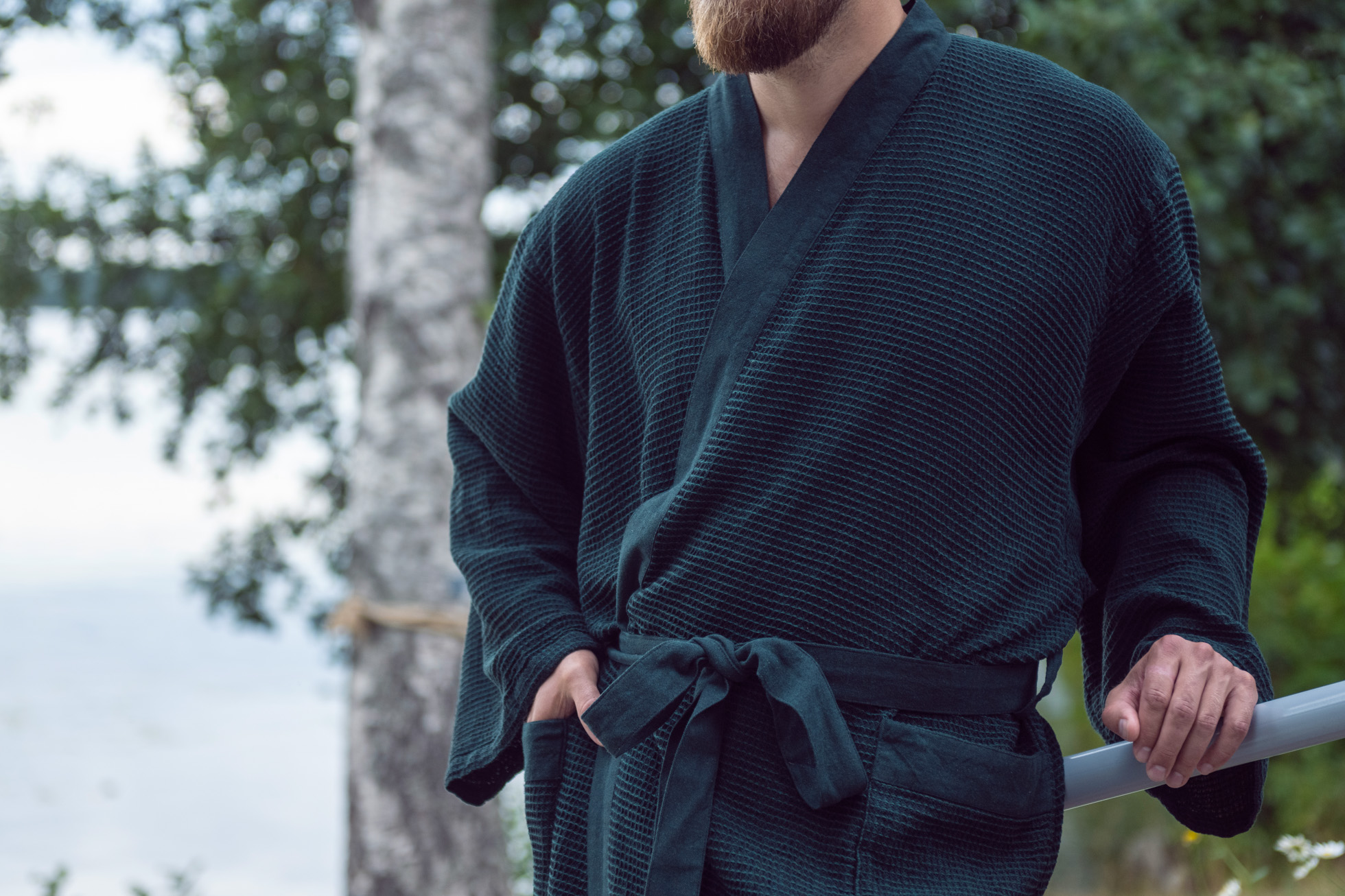 Mugav chambray ääriste ja vööga hommikumantel. Kenno saunatekstiilid on valmistatud taaskasutatud puuvillast, andes kangale loomuliku pehmuse ja särtsaka tekstuuri.