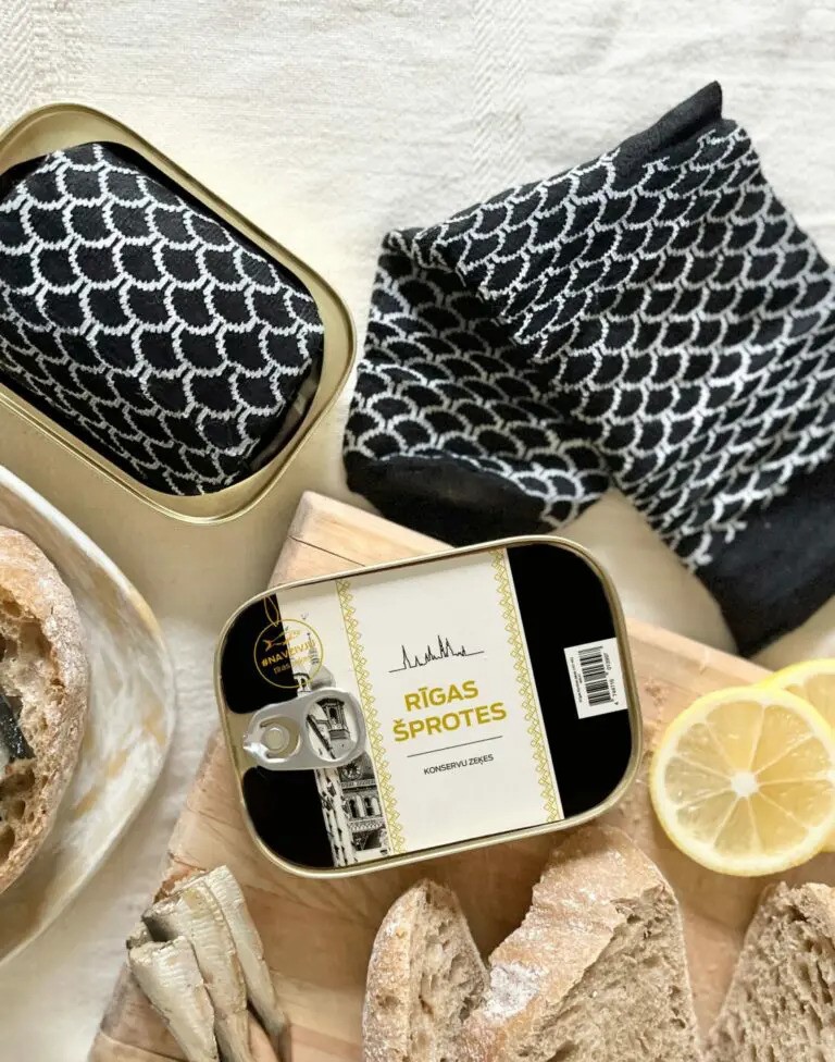 Sokid Riia sproti konservis nii meestele kui ka naistele. Välimus nagu ehtsal kalakonservil, sisu aga üllatavalt soe ja pehme. Need Riia sprotist inspireeritud sokid on mõnusalt naljakas ja ootamatu kingitus, mis paneb muigama nii avamisel kui kandmisel. Sokid on surutud konservikarpi täpselt nii, et kaal, kuju ja tunne oleksid nagu päris sprotid. Pärast avamist taastavad sokid oma pehmuse ja sobivad kandmiseks nii meestele kui naistele. Täiuslik viis hoida Riia vaim ja kerge huumor endaga kaasas.
