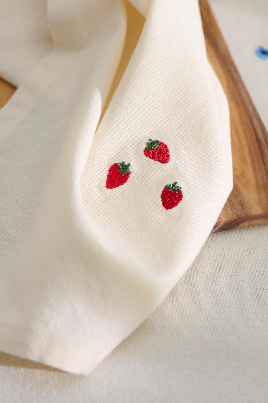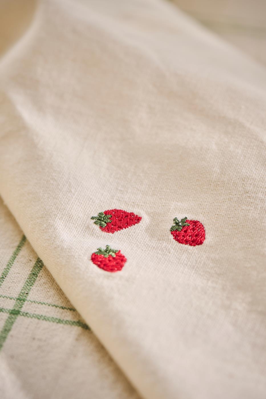 Kreemikas salvrätik maasika tikandiga, mis lisab lauale suviselt värske ja kutsuva ilme. Ideaalne aiapidudeks ja hubasteks eineteks päikesepaistel.